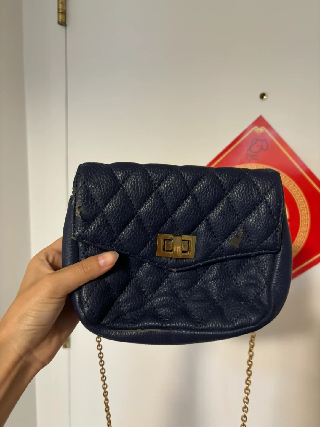 Giving away a cute navy blue quilted bag with a gold chain strap! It's a stylish little accessory that's perfect for adding a touch of elegance to any outfit. It's in used condition, so please check the photos for details