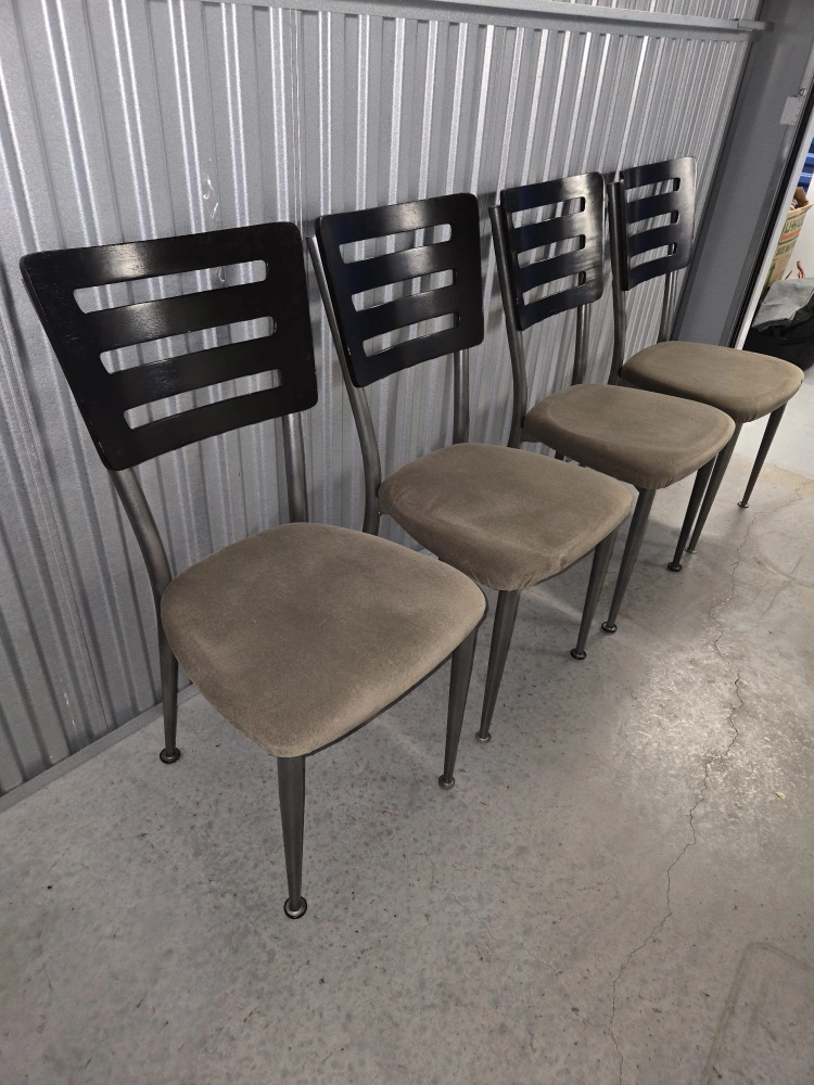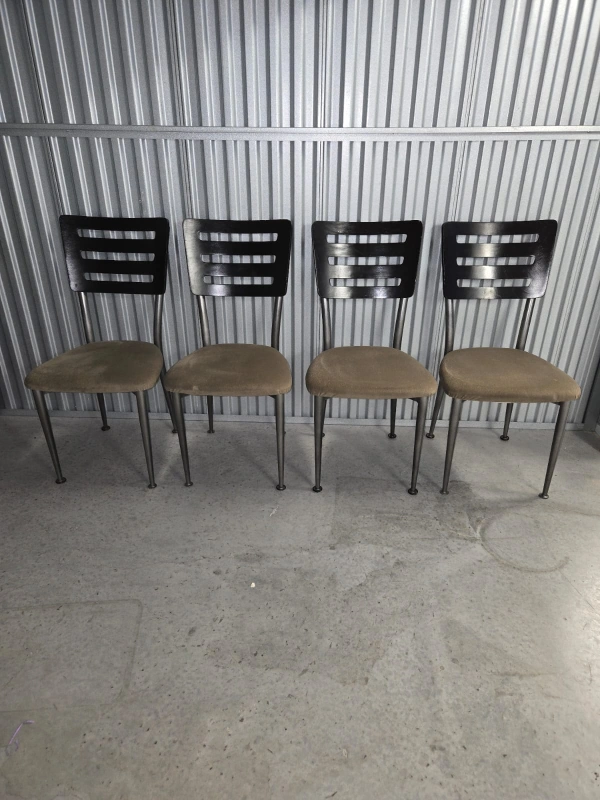 1000+Selling a set of four dining chairs. They have a brown frame and beige seat cushions. The chairs have a simple, modern design that would fit well in any dining room or kitchen. They are in used condition.