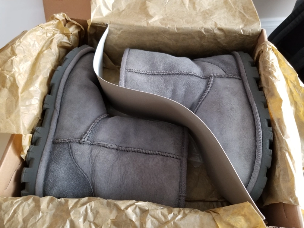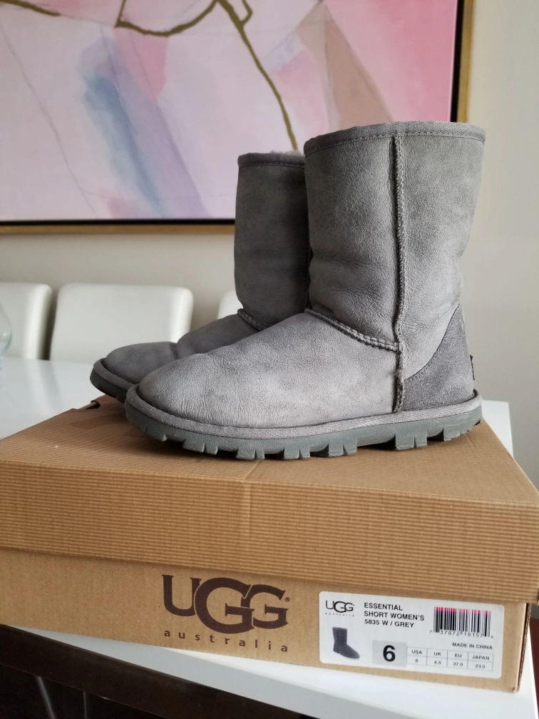 580Selling a pair of UGG Essential Short women's boots in grey, size 6. These cozy boots come with the original box. They are in good condition and ready for a new home!