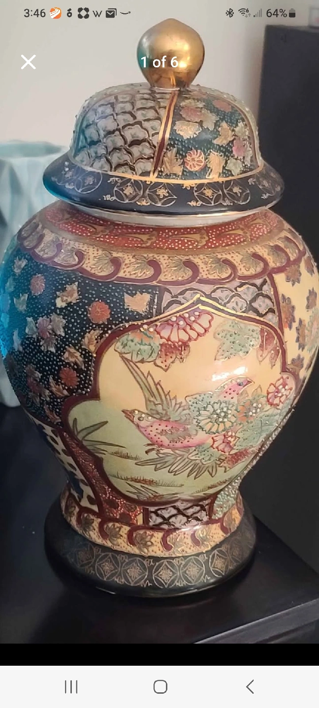 Beautiful decorative jar with lid. It features intricate floral and bird designs in a variety of colours. The bottom has a 'Made in China'