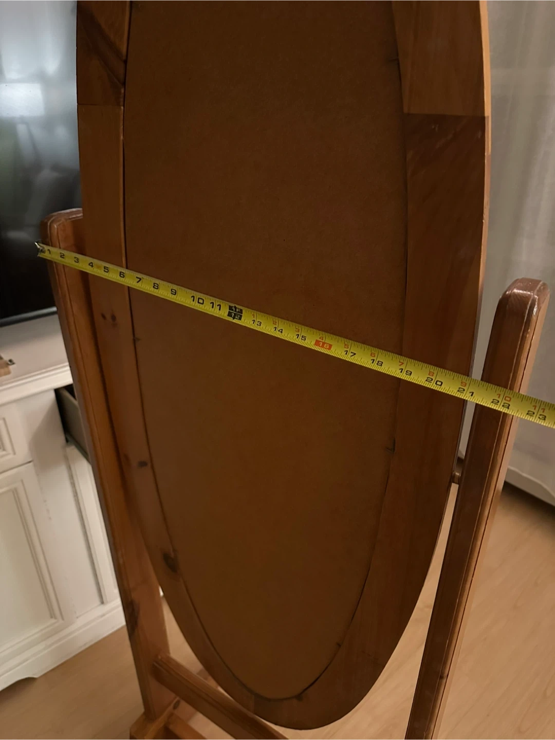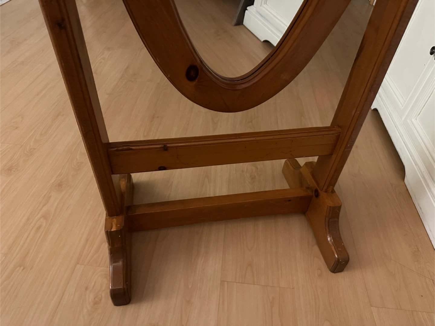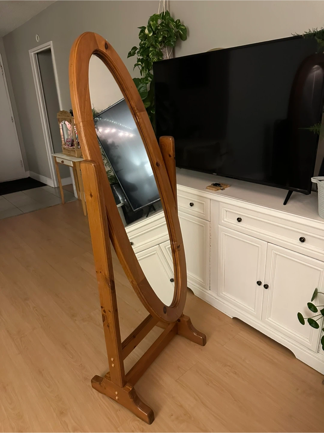 Selling a lovely oval-shaped floor mirror with a wooden frame. It's in great condition and would look perfect in a bedroom or living room. The mirror is sturdy and provides a full-length reflection. It's a great addition to any home!