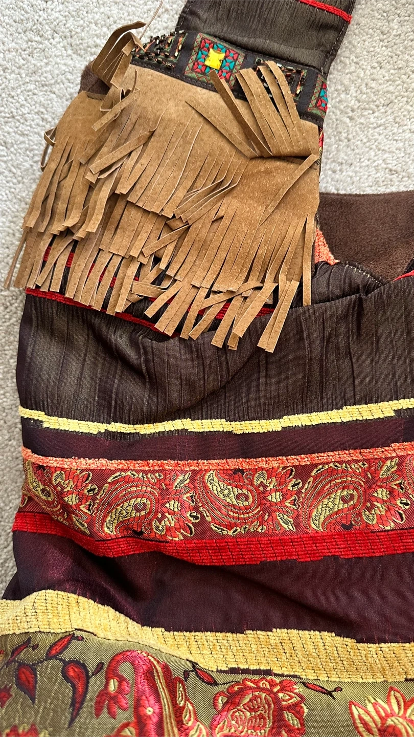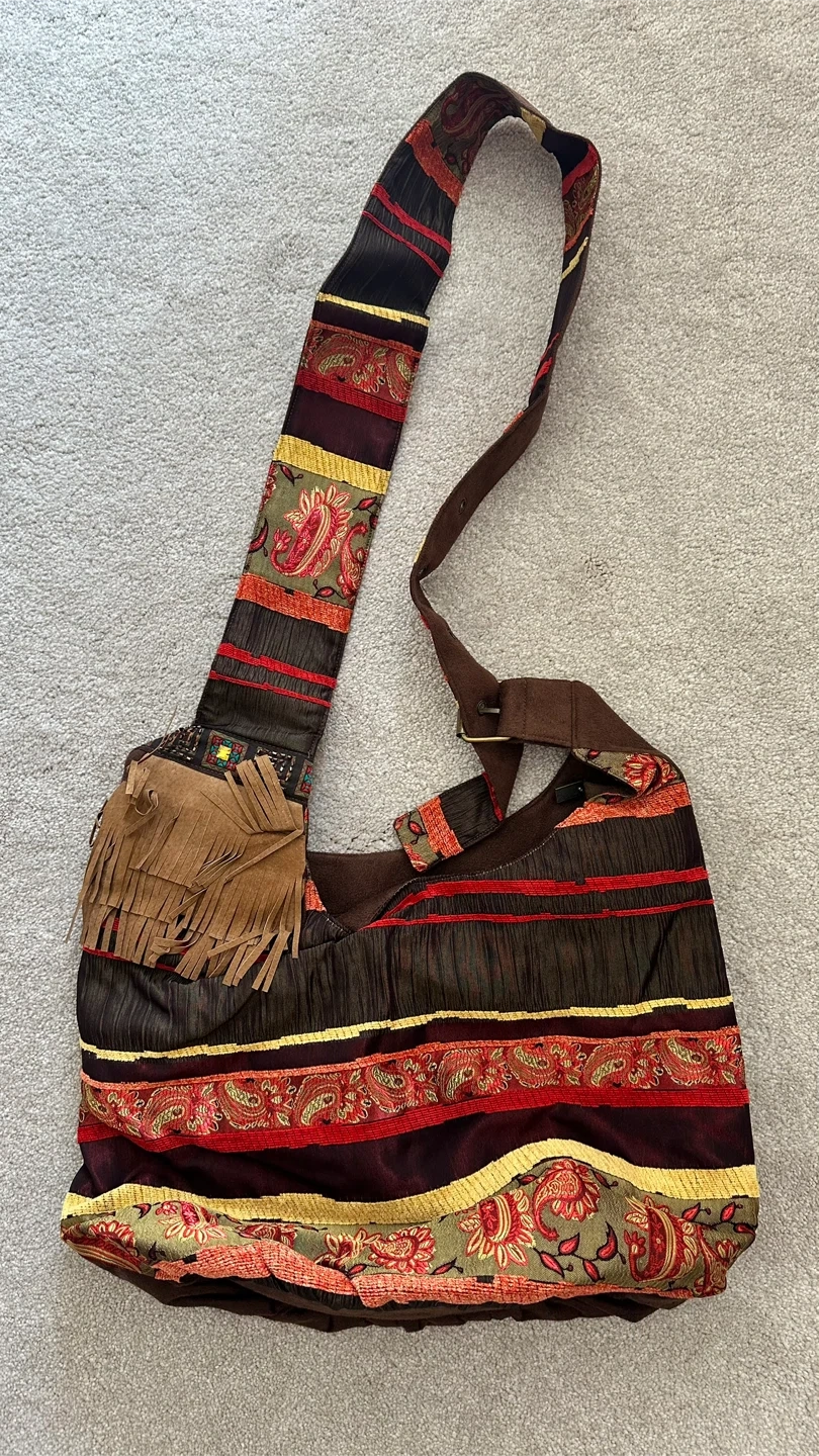 This is a unique boho-style shoulder bag with fun fringe detailing! It features a mix of textures and patterns in earthy tones. Perfect for adding a bit of flair to your outfit!