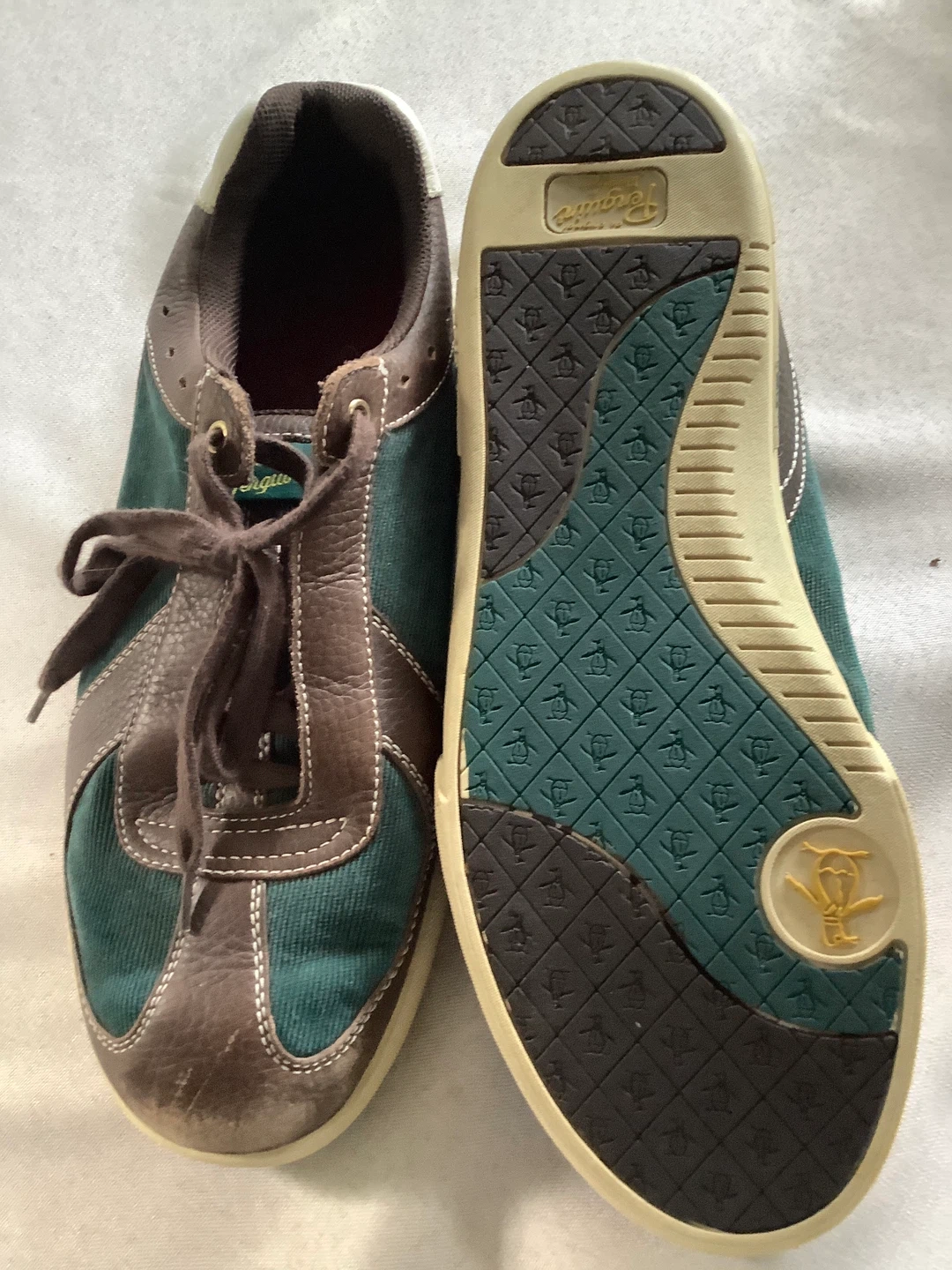 20Selling a pair of Penguin sneakers in a mix of brown leather and green corduroy. They show some signs of wear, but the soles still have plenty of life left! Great for a casual, retro look