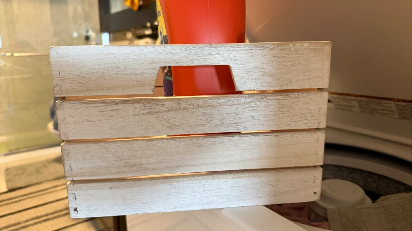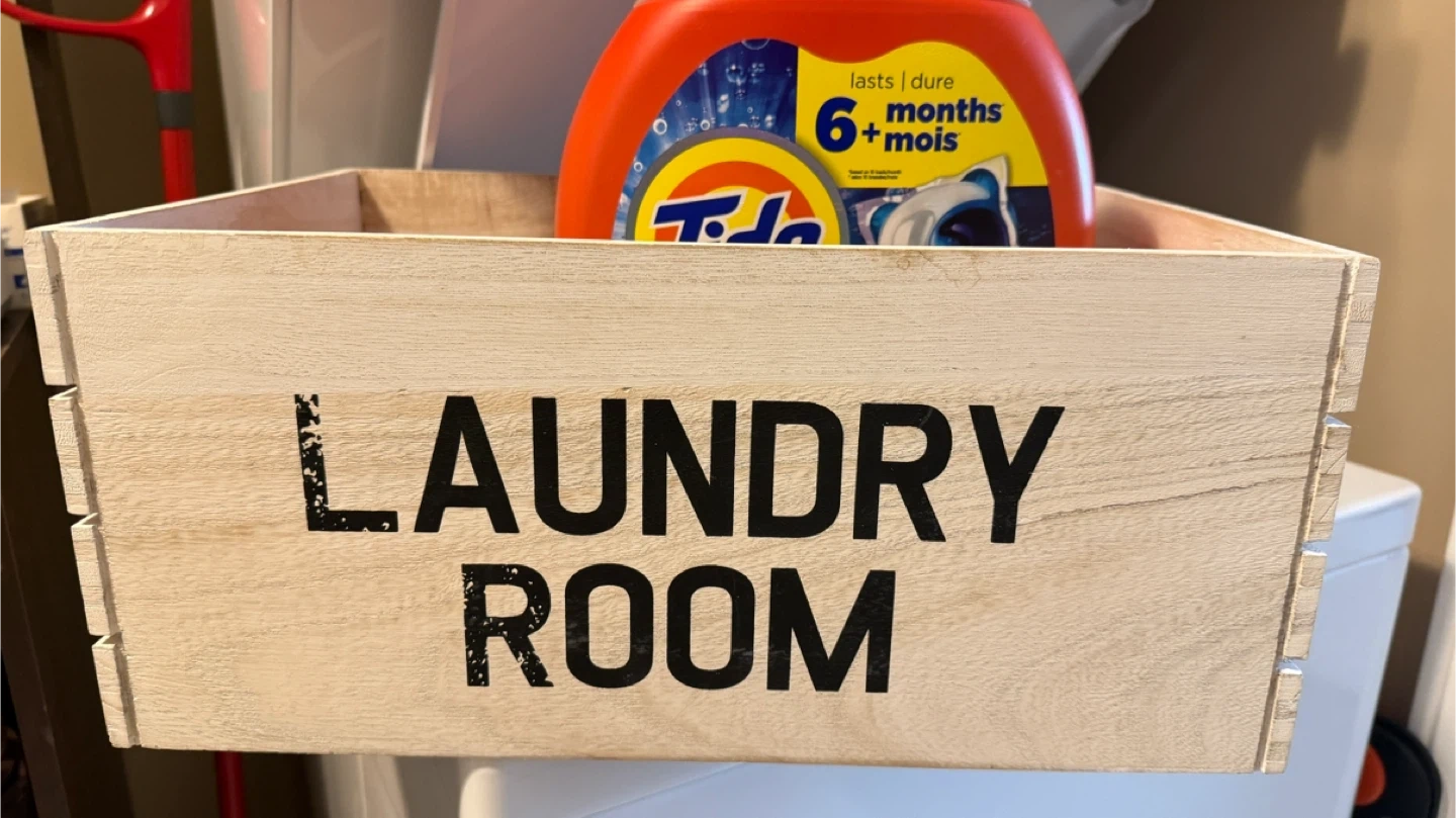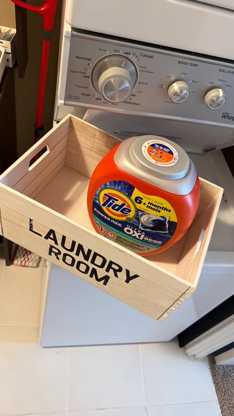 Here's a wooden crate perfect for organizing your laundry room! It has "LAUNDRY ROOM" printed on the side in black letters. It's in great condition and ready to help keep your space tidy. PLEASE NOTE: Pickup in Tuscany area. Price is firm. Cash only. Please send me a message with date/time to pickup. Will not respond to "Is it available?" kind of messages.