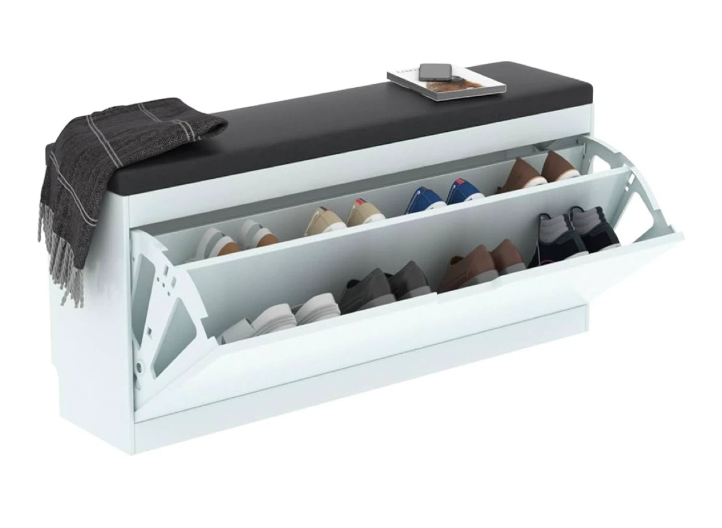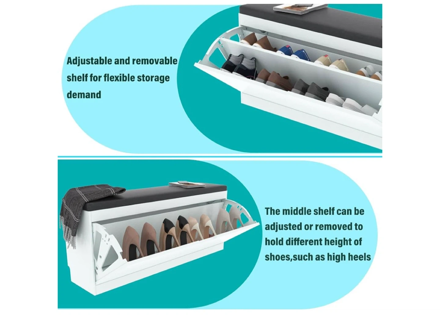 This shoe storage bench is perfect for keeping your entryway organized! It features a padded seat for comfortable seating while you put on or take off your shoes. The bench has a removable shelf to accommodate different shoe heights, even high heels. It's also designed to be breathable and easy to clean, making it a practical and stylish addition to your home