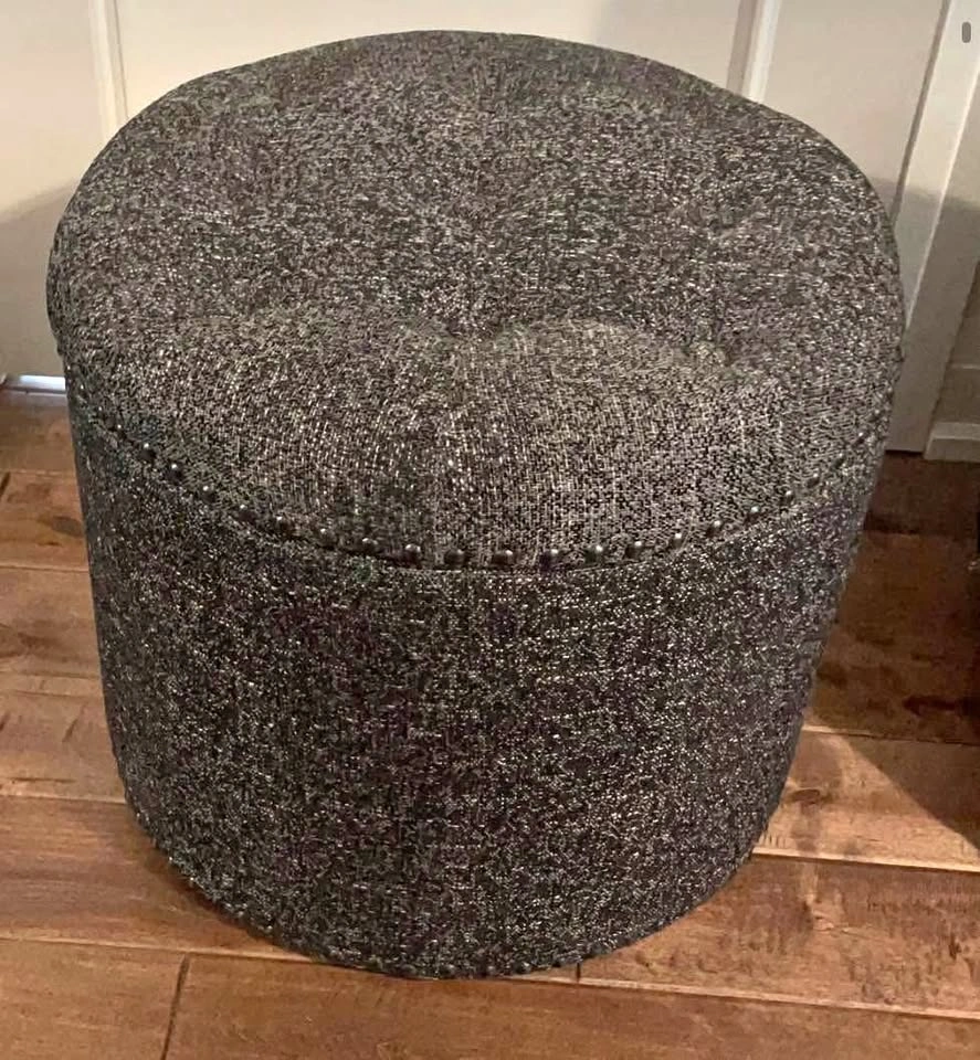 Selling a round storage ottoman in a neutral grey colour. It's in great condition and perfect for extra seating or storage in a small space. The top lifts off to reveal a storage compartment inside, making it super functional for blankets, toys, or anything else you want to keep out of sight. The fabric is a textured weave, and it has decorative nailhead trim around the base.
