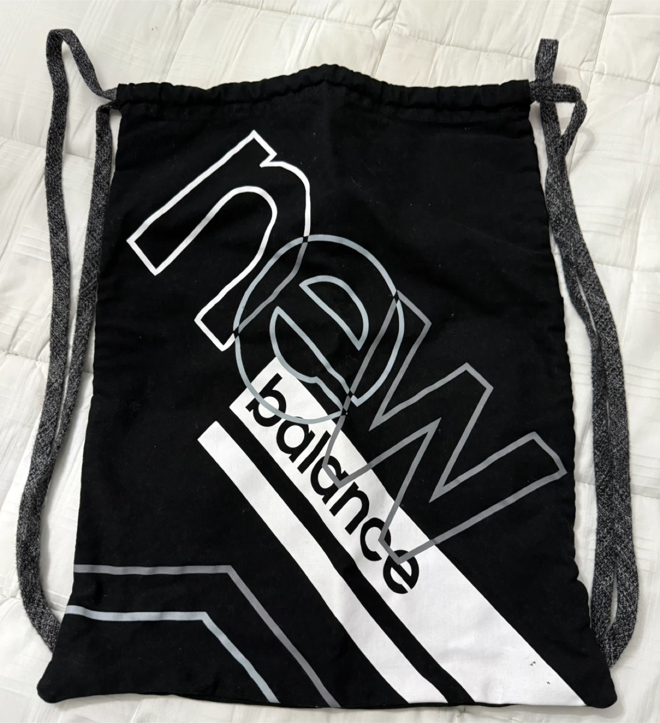 This is a black drawstring bag from New Balance. It's in great shape and perfect for carrying your gym clothes or everyday essentials. The bag features the New Balance logo. It's lightweight and easy to carry around