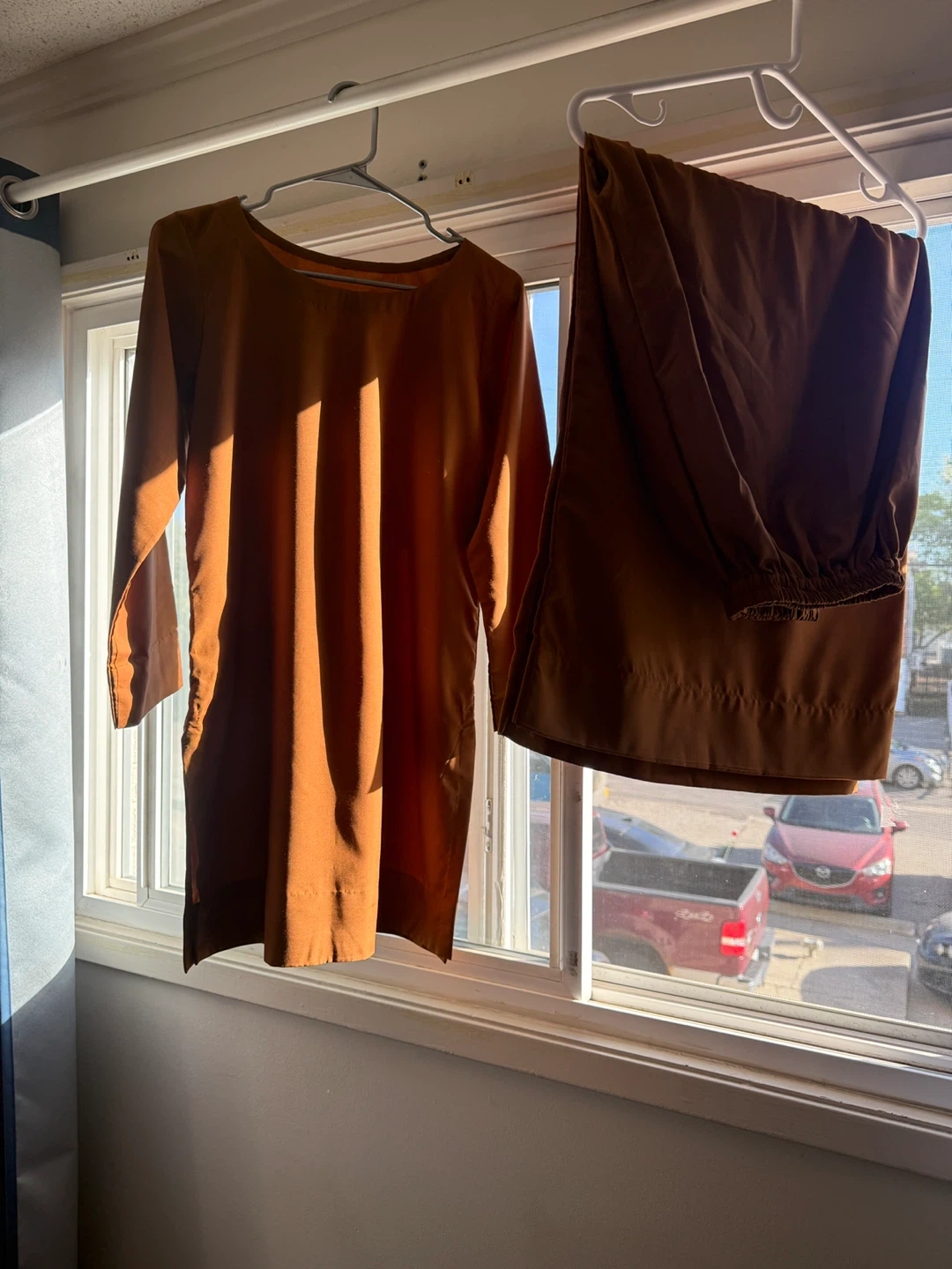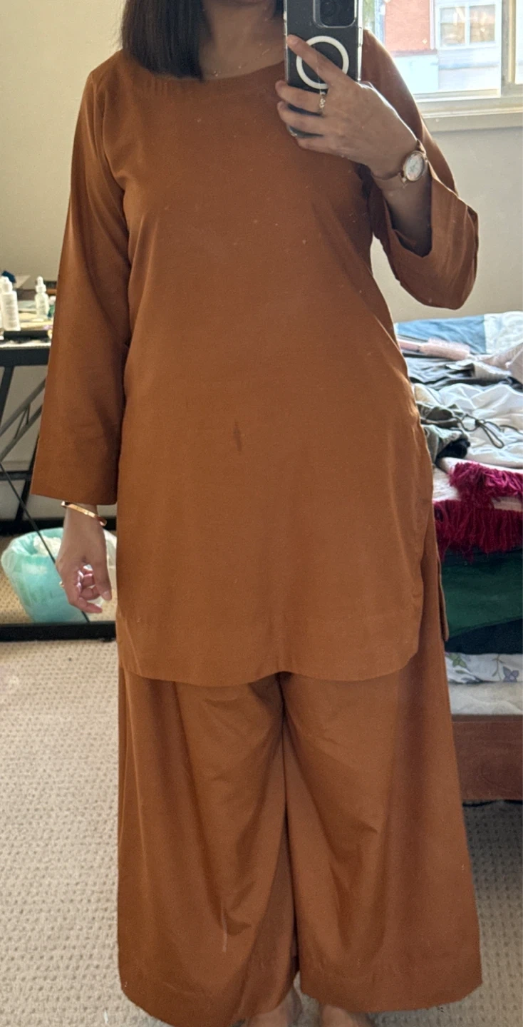 Selling a brown salwar kameez suit. It's in good condition and perfect for everyday wear or special occasions. The colour is a warm brown. There is a stain on the top.