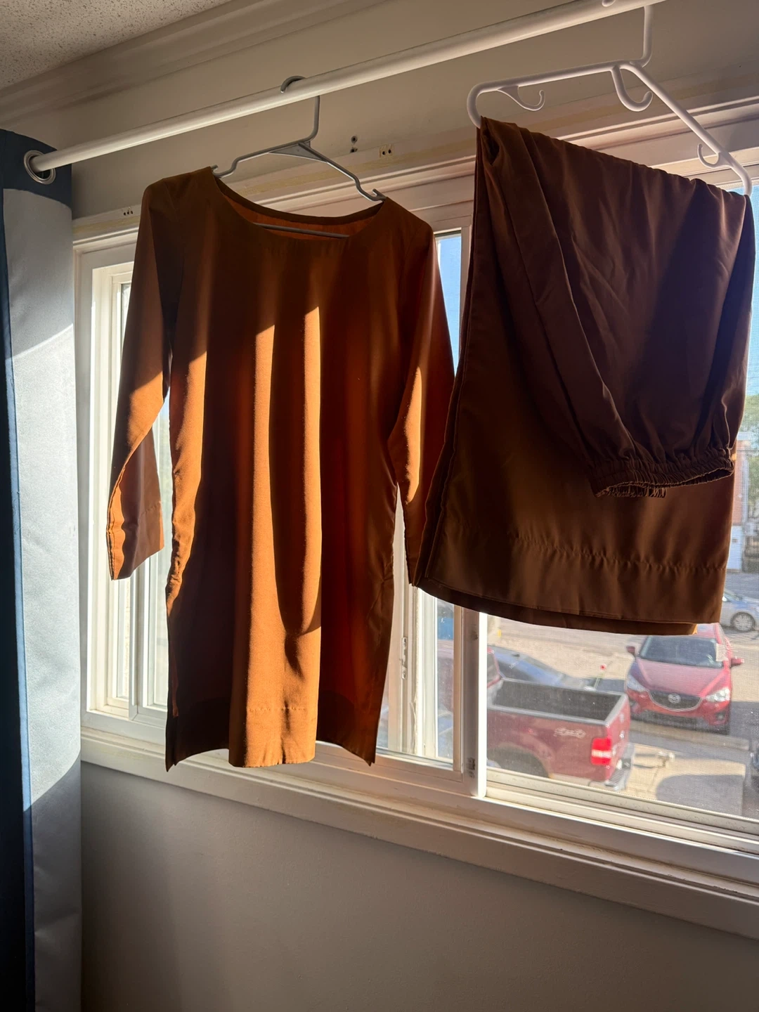Selling a brown salwar kameez suit. It's in good condition and perfect for everyday wear or special occasions. The colour is a warm brown. There is a stain on the top.