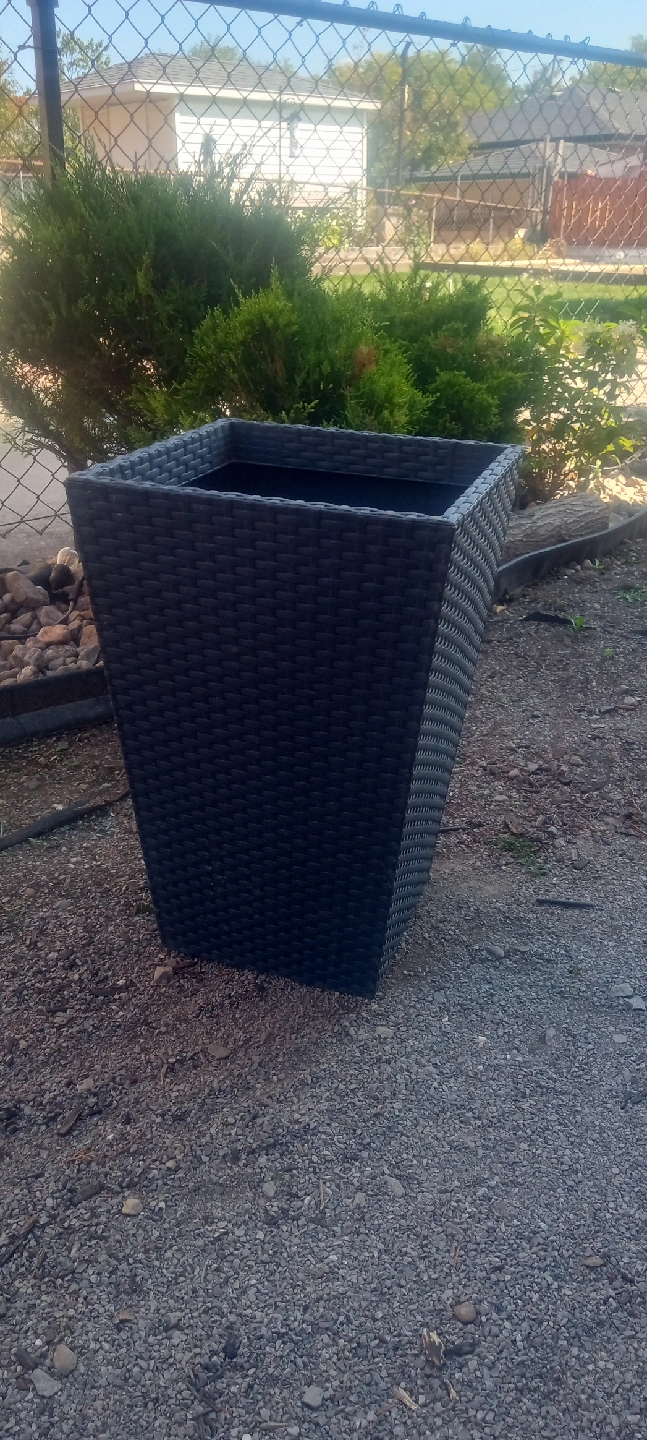 These tall outdoor planter with a black wicker-look finish! It's perfect for adding some greenery to your porch or garden or mums in the autumn, or beautiful Christmas arrangementa with lights. Many choices