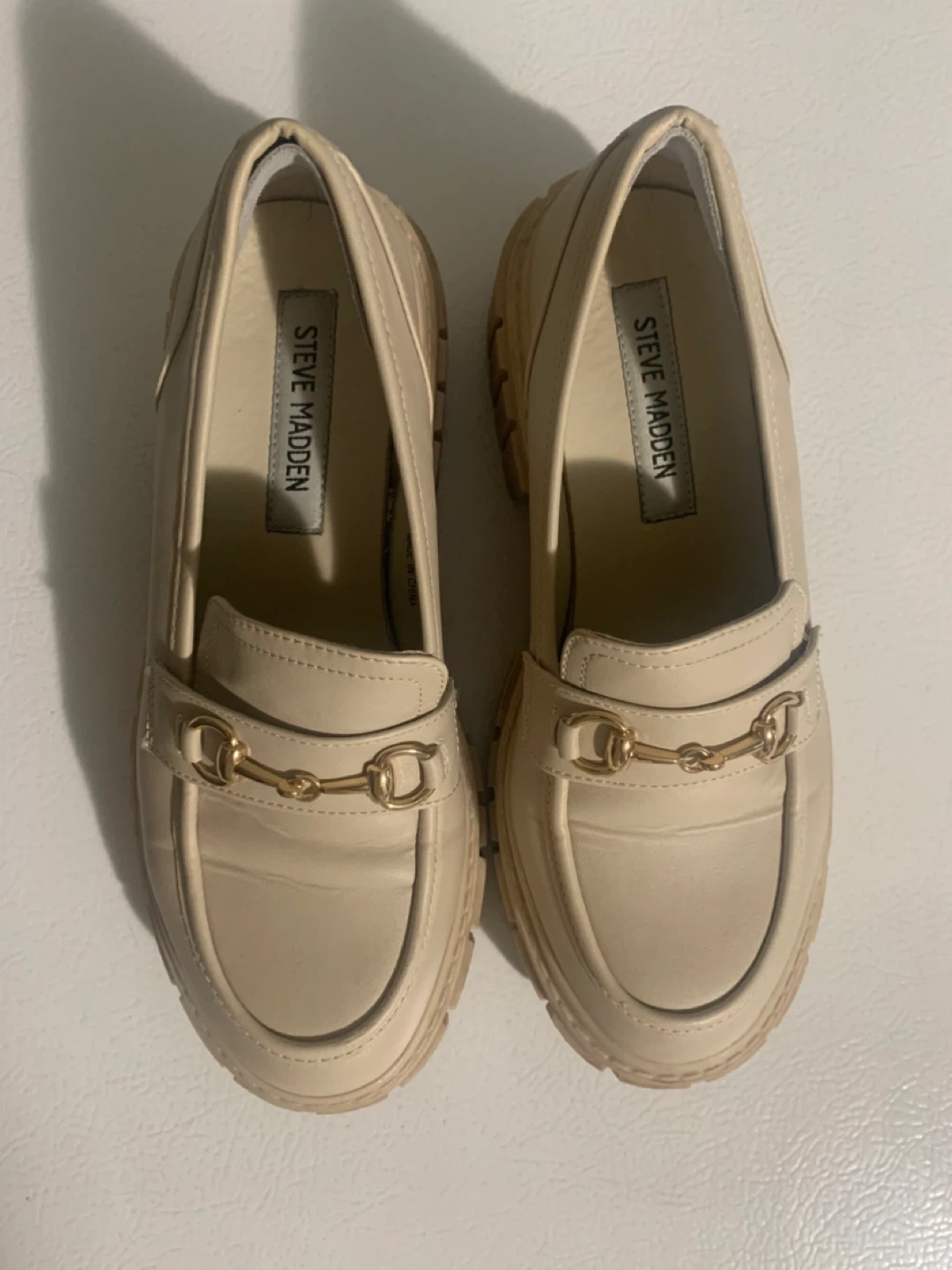 Giving away for free a pair of Steve Madden loafers in a lovely cream colour! They're a size 7 and feature a chunky sole and gold-tone hardware detail. Perfect for adding a bit of edge to any outfit