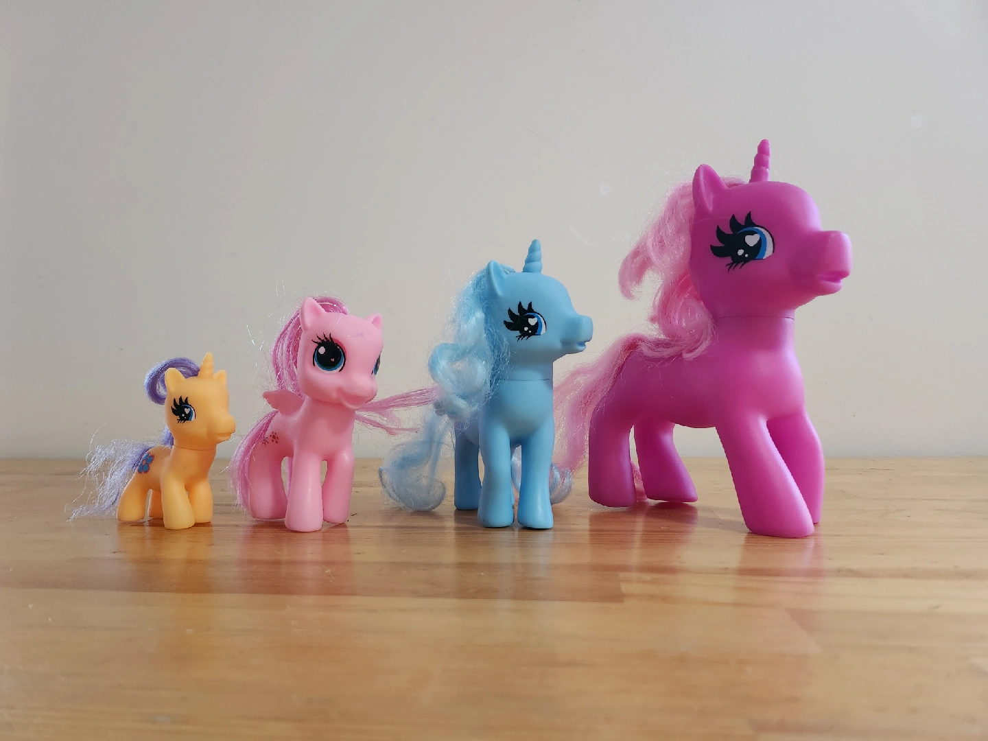 Set of four My Little Pony figures. They come in various colours like pink, blue, and yellow. Perfect for collectors or kids who love these classic toys.