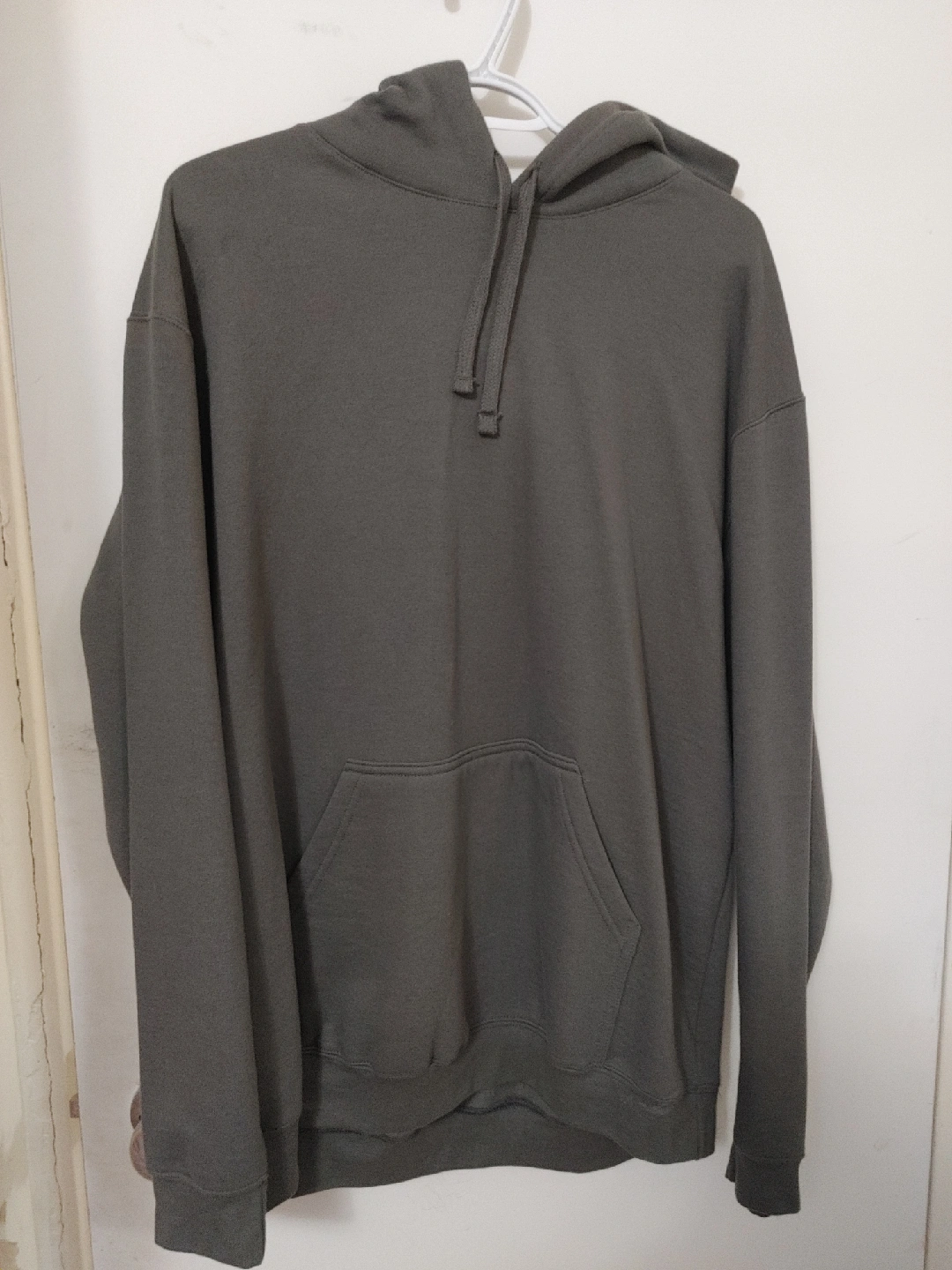 Cozy dark grey hoodie by Deluxe by M&O, perfect for layering! It's a size large and made from a blend of 50% cotton and 50% polyester. Features a classic kangaroo pocket and a comfortable hood with drawstrings. The back has a unique design printed on it. Great for everyday wear. *cash only*