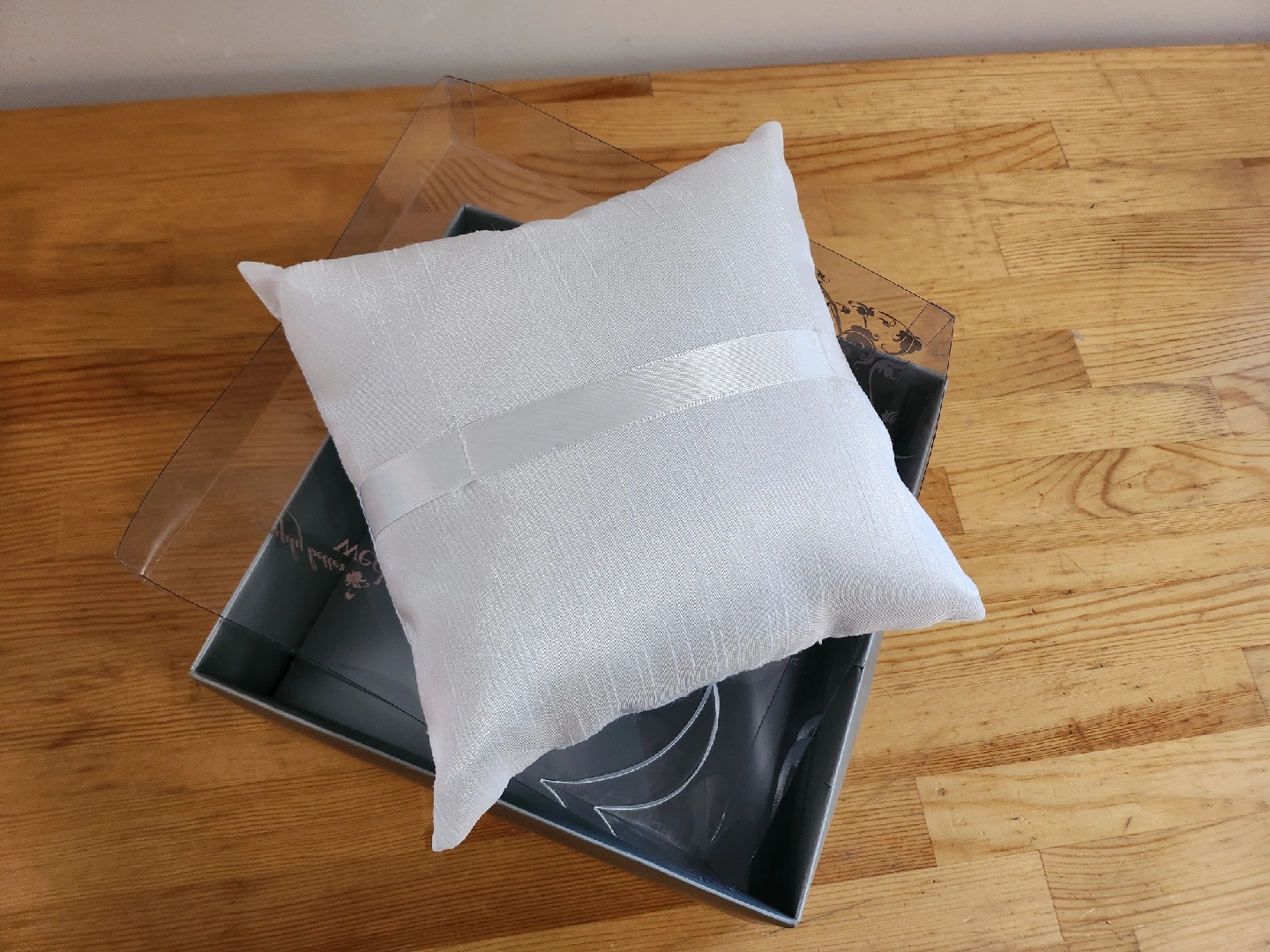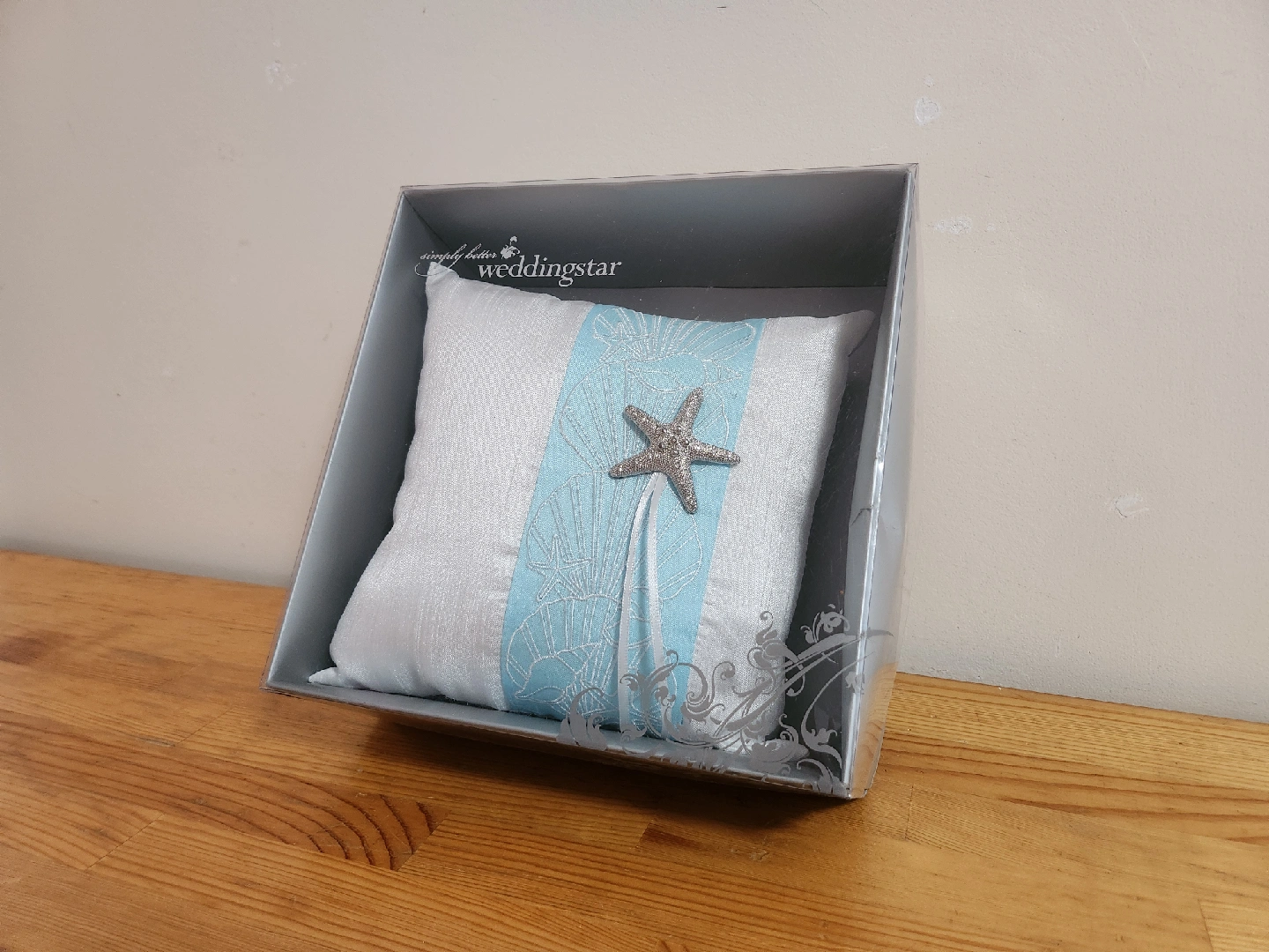 Weddingstar ring bearer pillow. It comes in its original box. The pillow is white with a light blue accent and a elegant solid metallic starfish decoration!