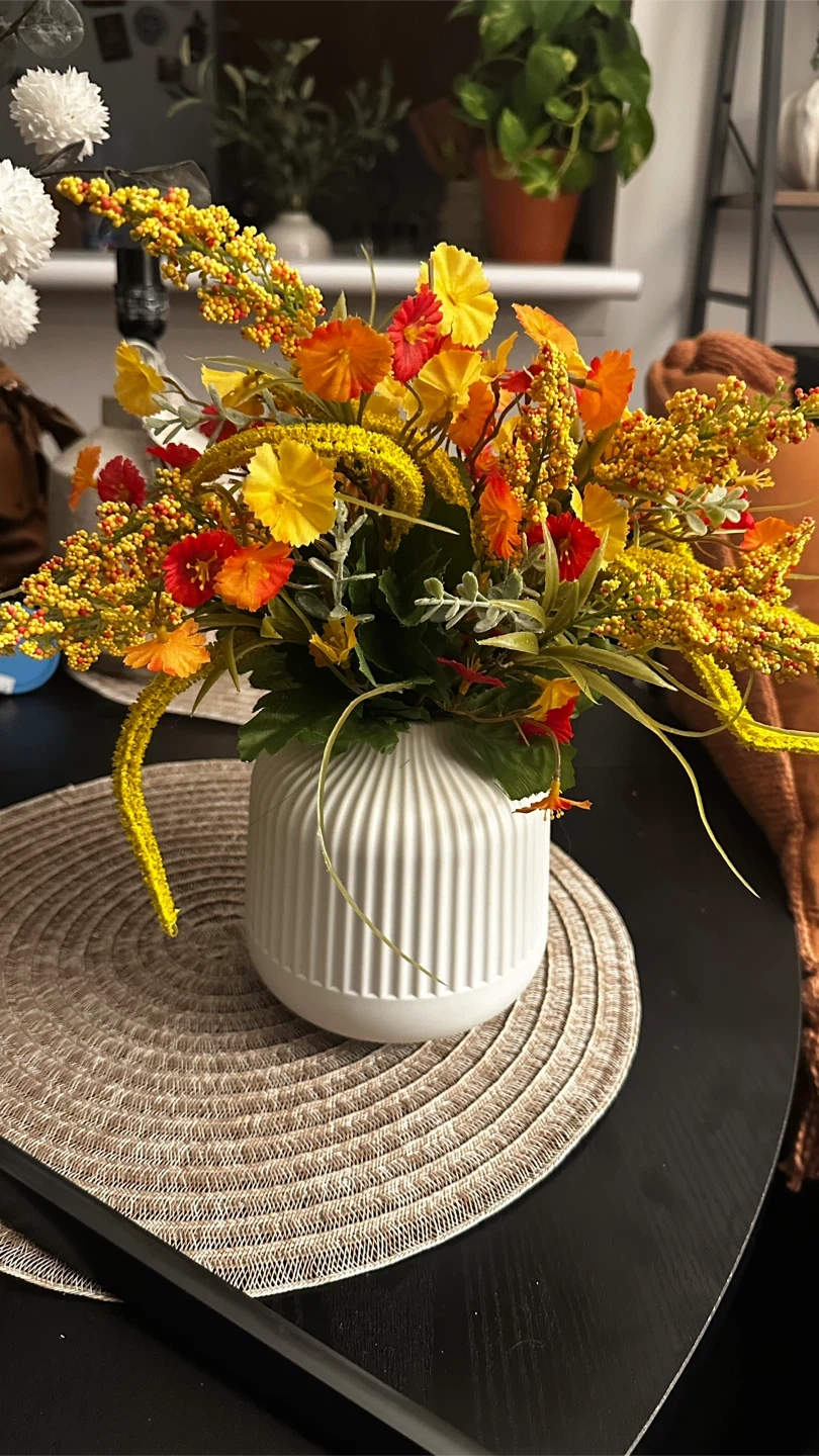 A beautiful floral arrangement featuring vibrant yellow, orange, and red flowers in a stylish plastic white vase. Perfect for adding a touch of color to any room. Vase is about 8 inches tall.