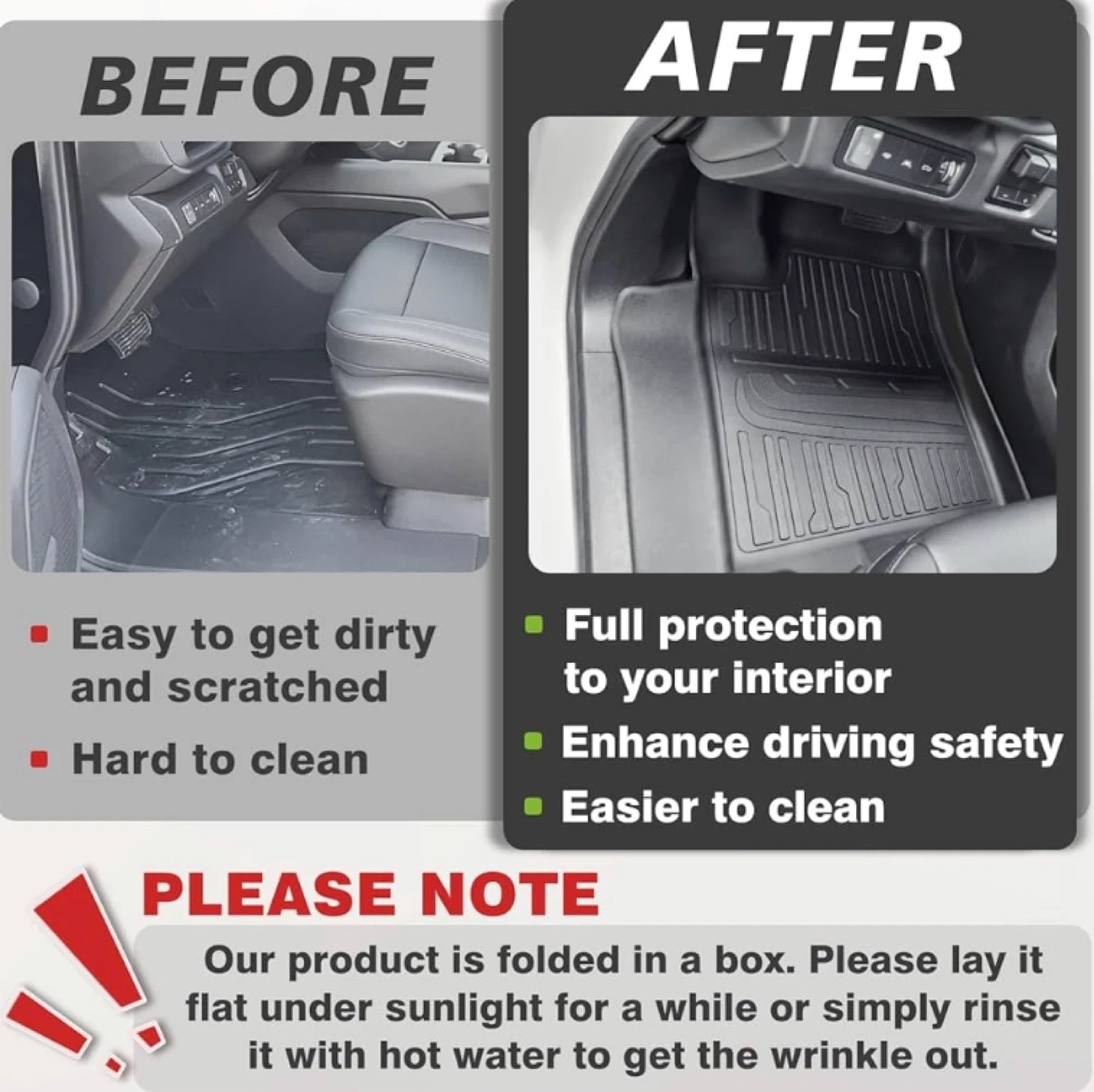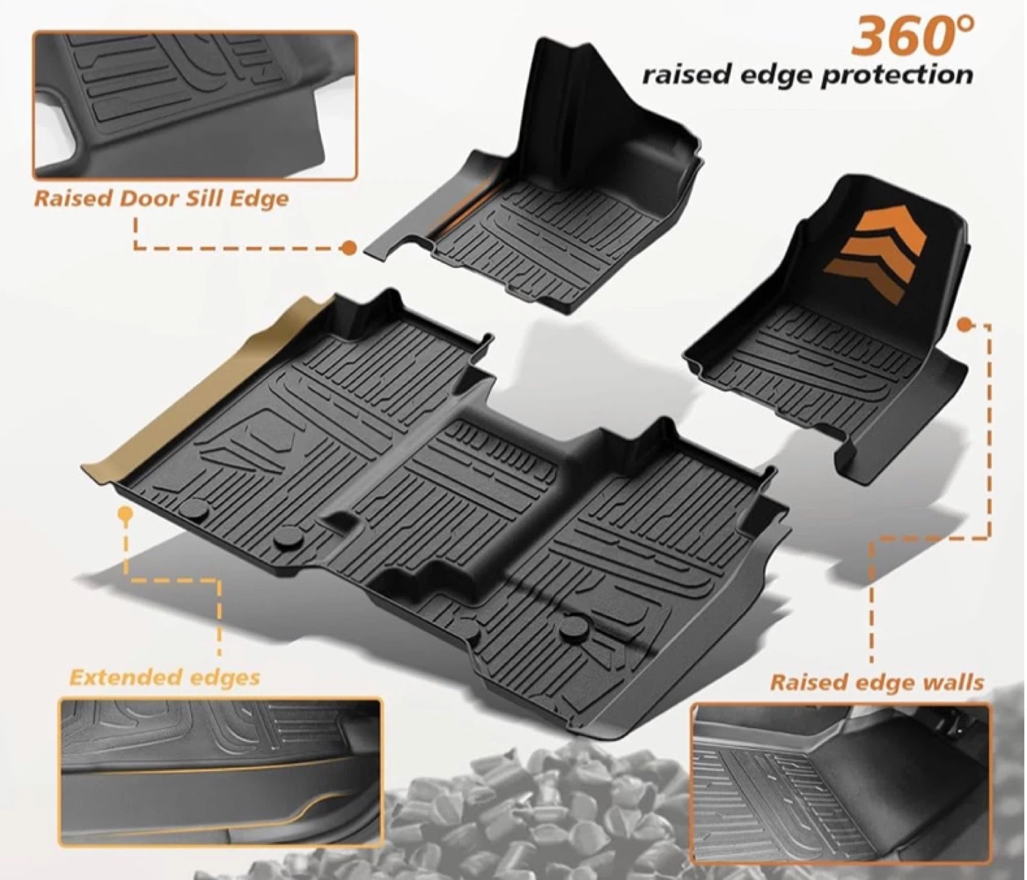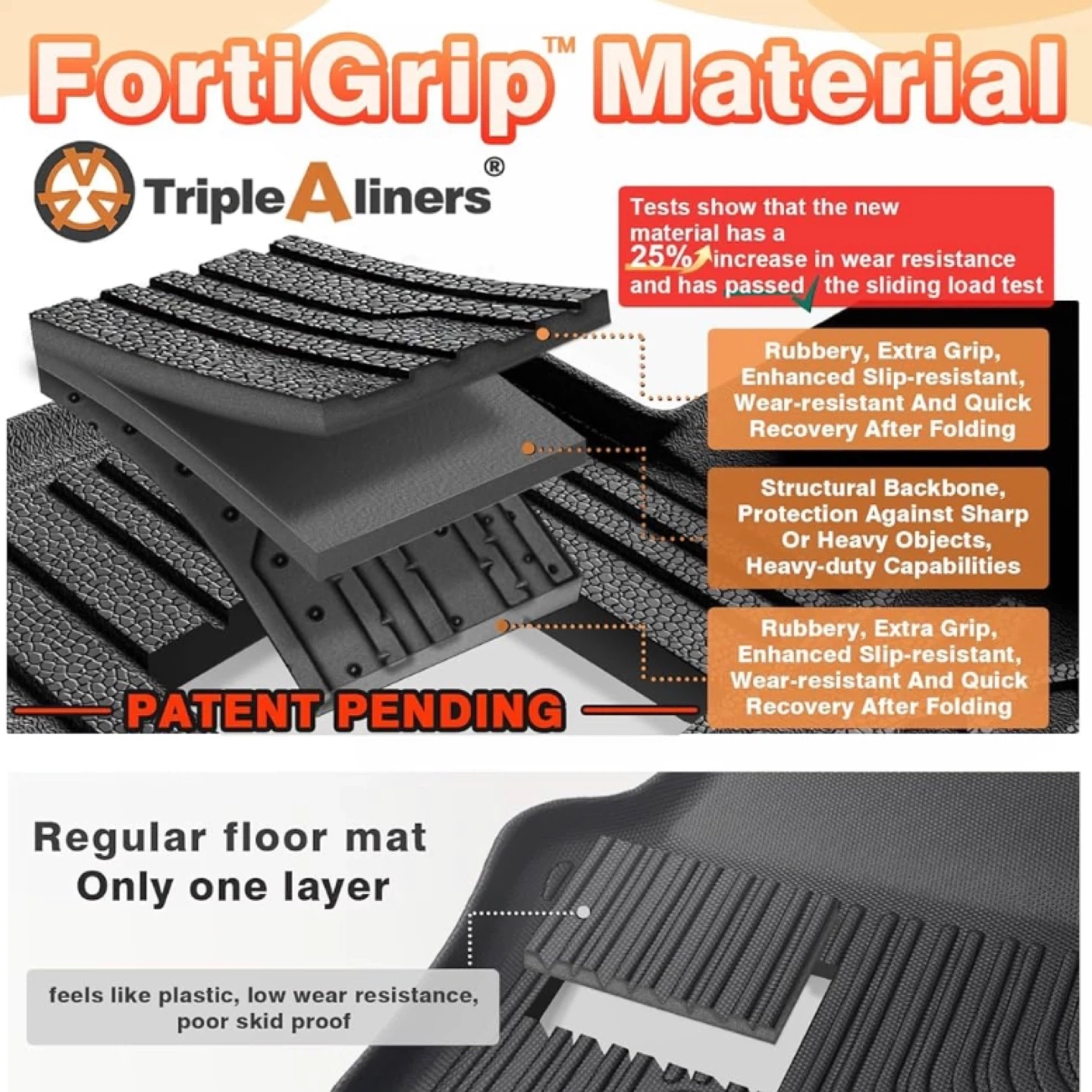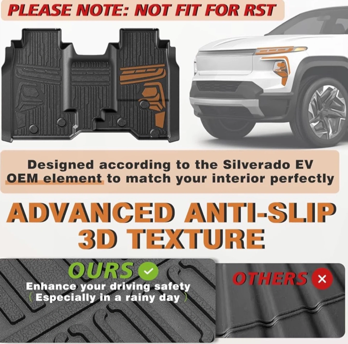 These Triple A Liners floor mats are designed to fit the Silverado EV WT model perfectly. They feature a raised edge protection and extended edges, plus raised edge walls for extra coverage. The FortiGrip material offers enhanced slip-resistance and quick recovery after folding. They're designed with an advanced anti-slip 3D texture to enhance driving safety, especially on rainy days.