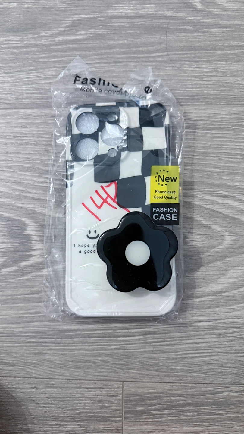 Selling a brand new fashion phone case with a checkered design! It comes with a flower-shaped phone grip for extra convenience and style. Good quality and ready to protect your phone in style