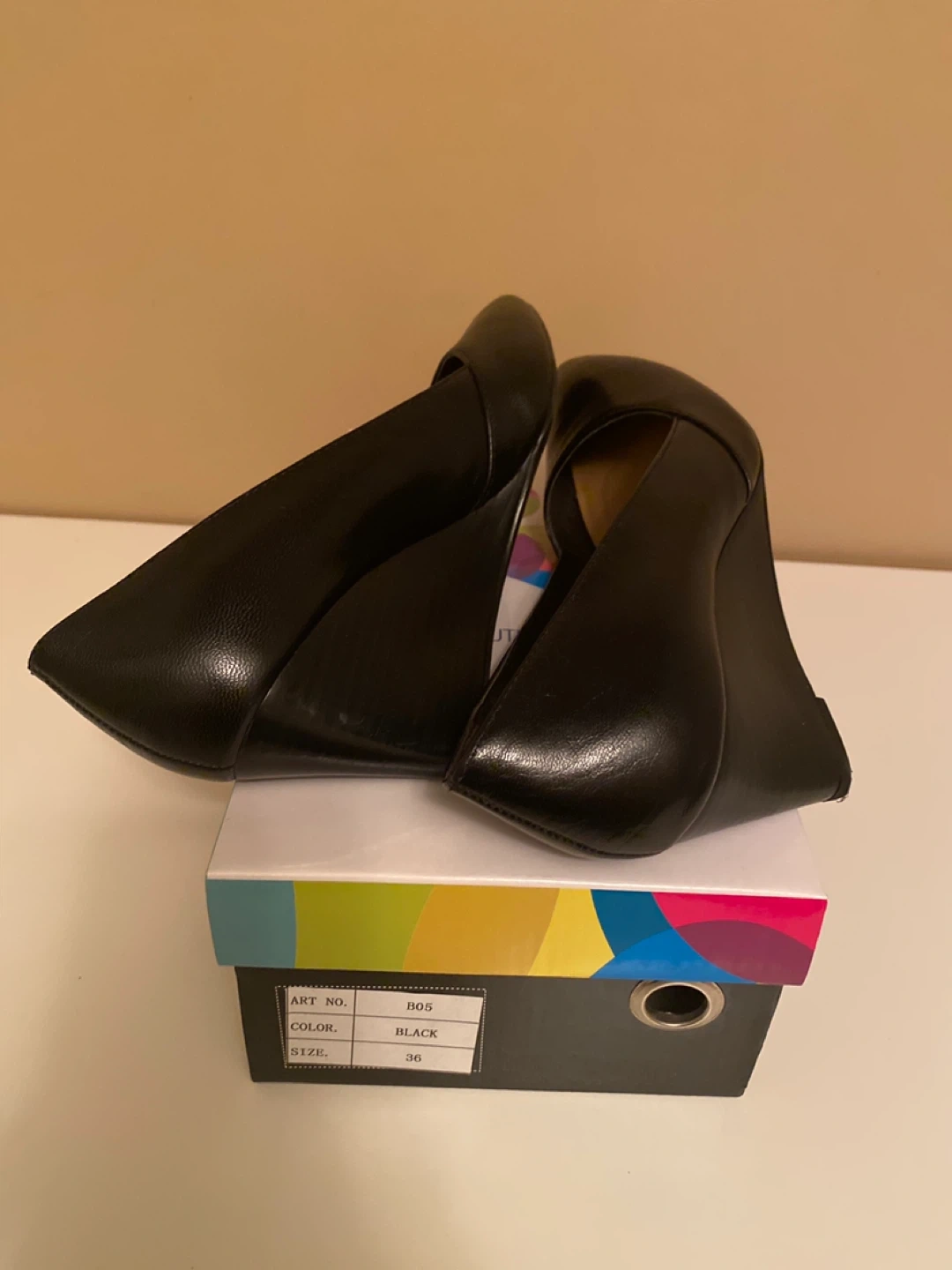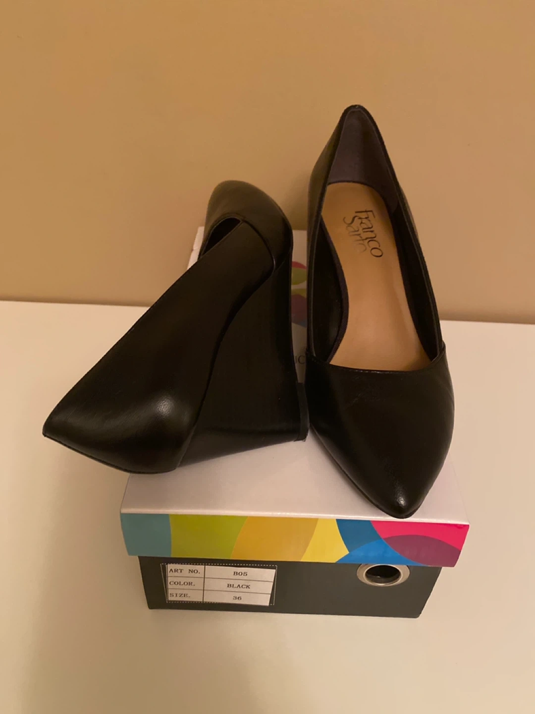 10Selling a pair of Franco Sarto wedge heels in black! They are a size 6 and come with the original box. Perfect for a night out or a day at the office