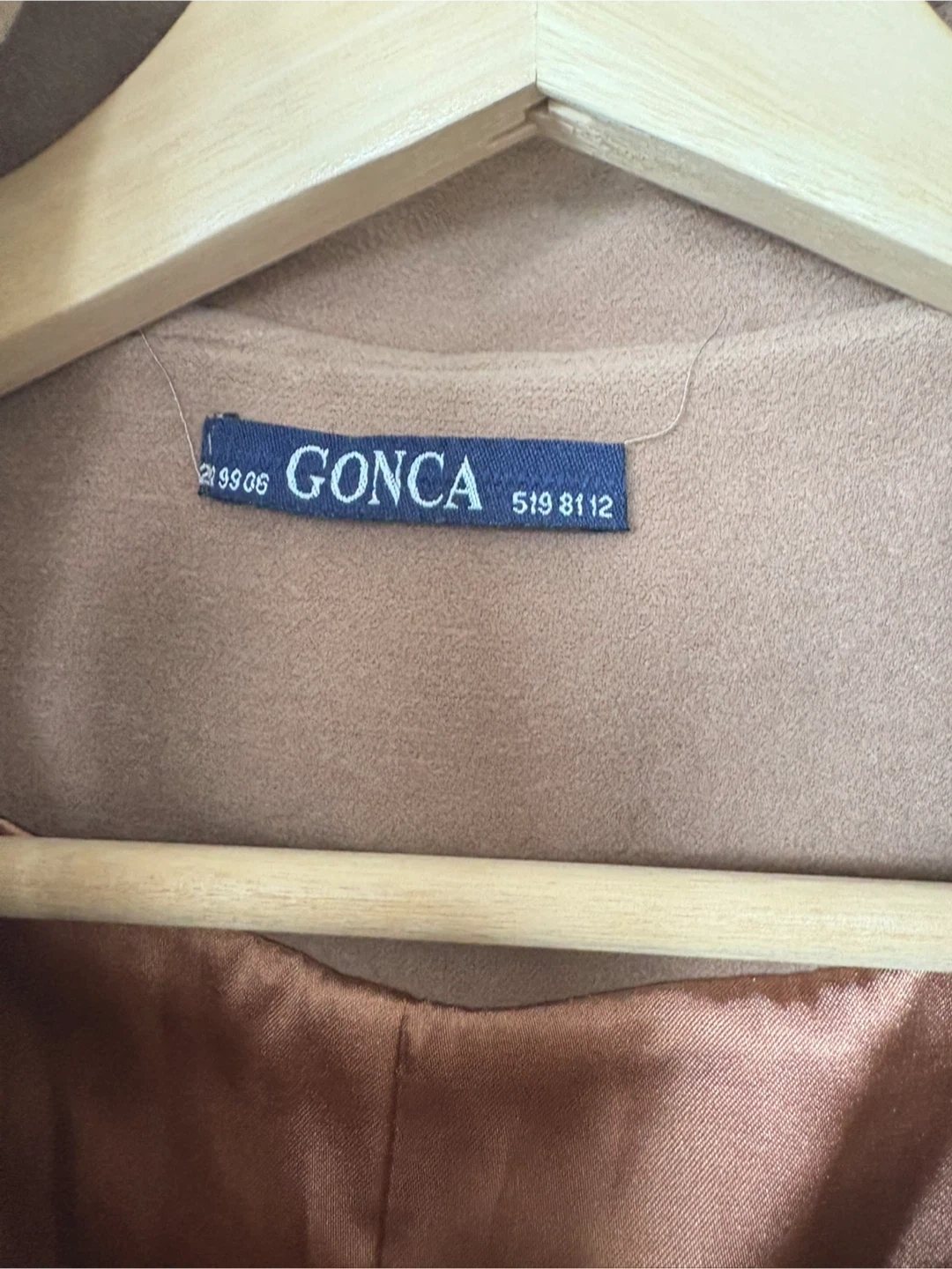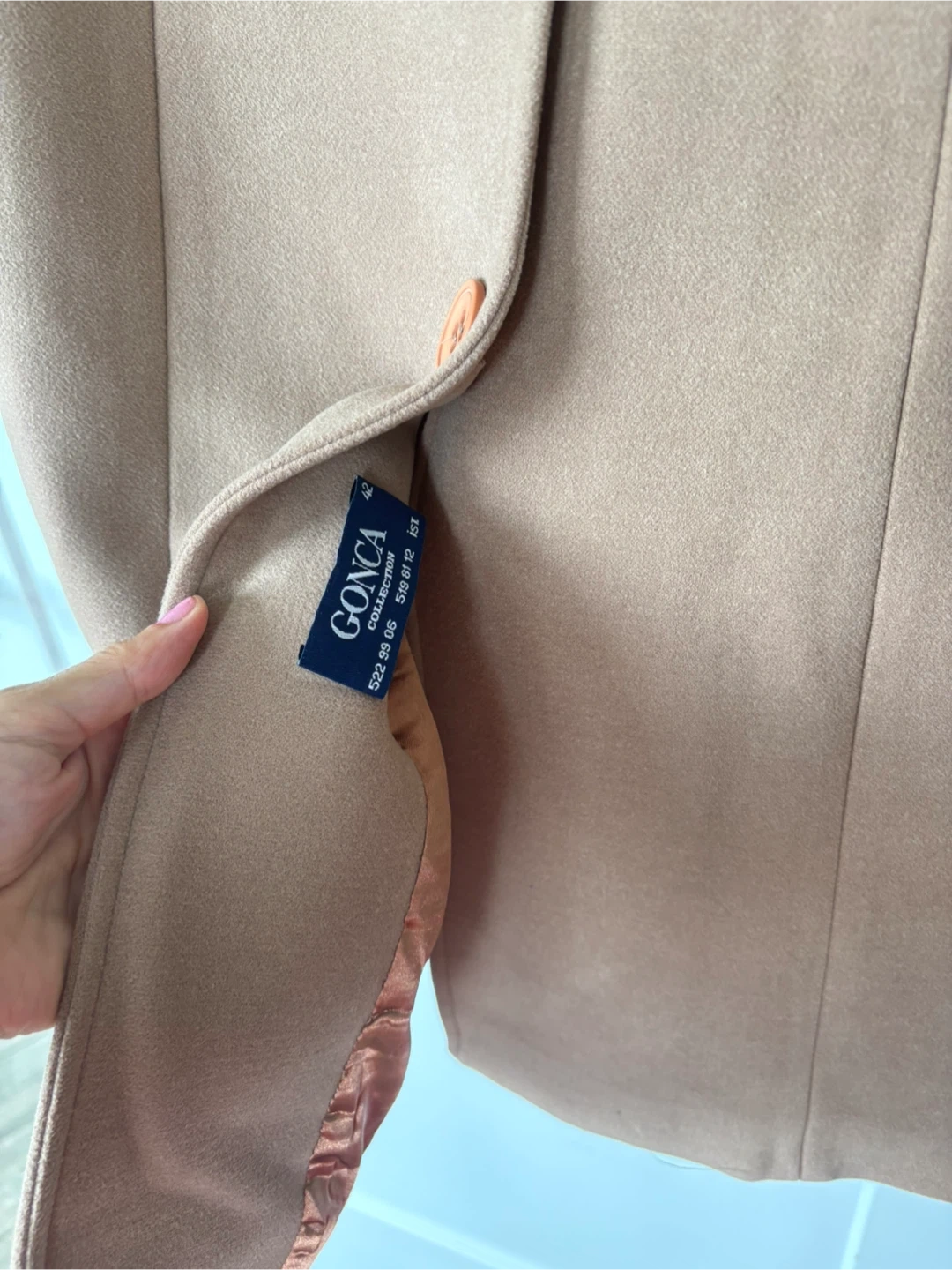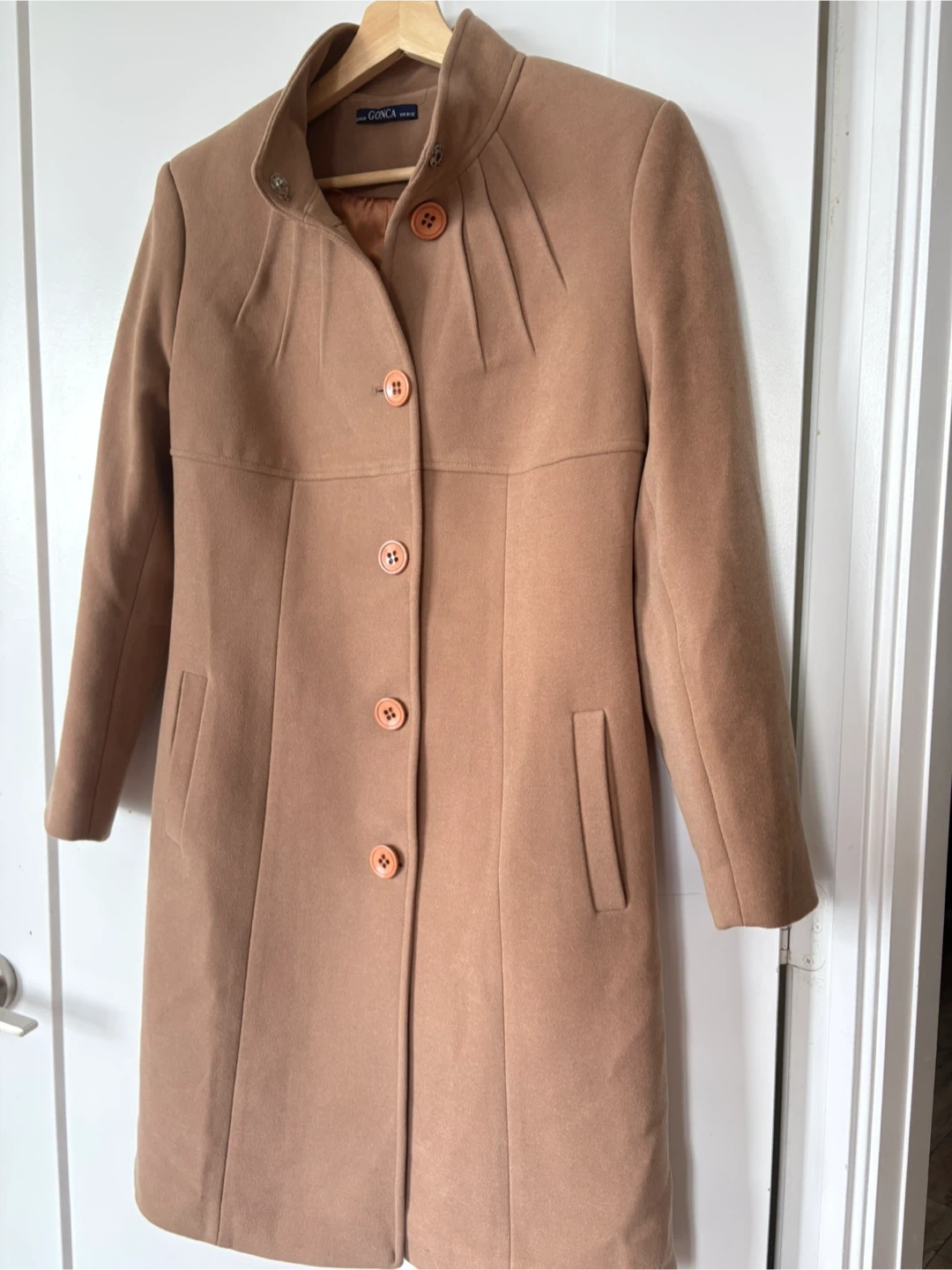 84A stylish beige coat from Gonca Collection, perfect for cooler weather! It's a size M features a button-up design with a unique neckline. Great for adding a touch of elegance to your outfit. Europe brand I have more as well never wore Feel free to also check my other listings make a bundle with discount. #coat #jacket #winter jacket #wool jacket #JacketSeason #WinterJacket #LeatherJacket #BomberJacket #DenimJacket #PufferJacket #CozyJackets #Outerwear #StayWarmInStyle