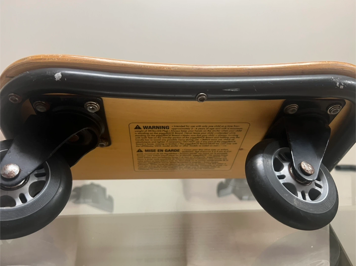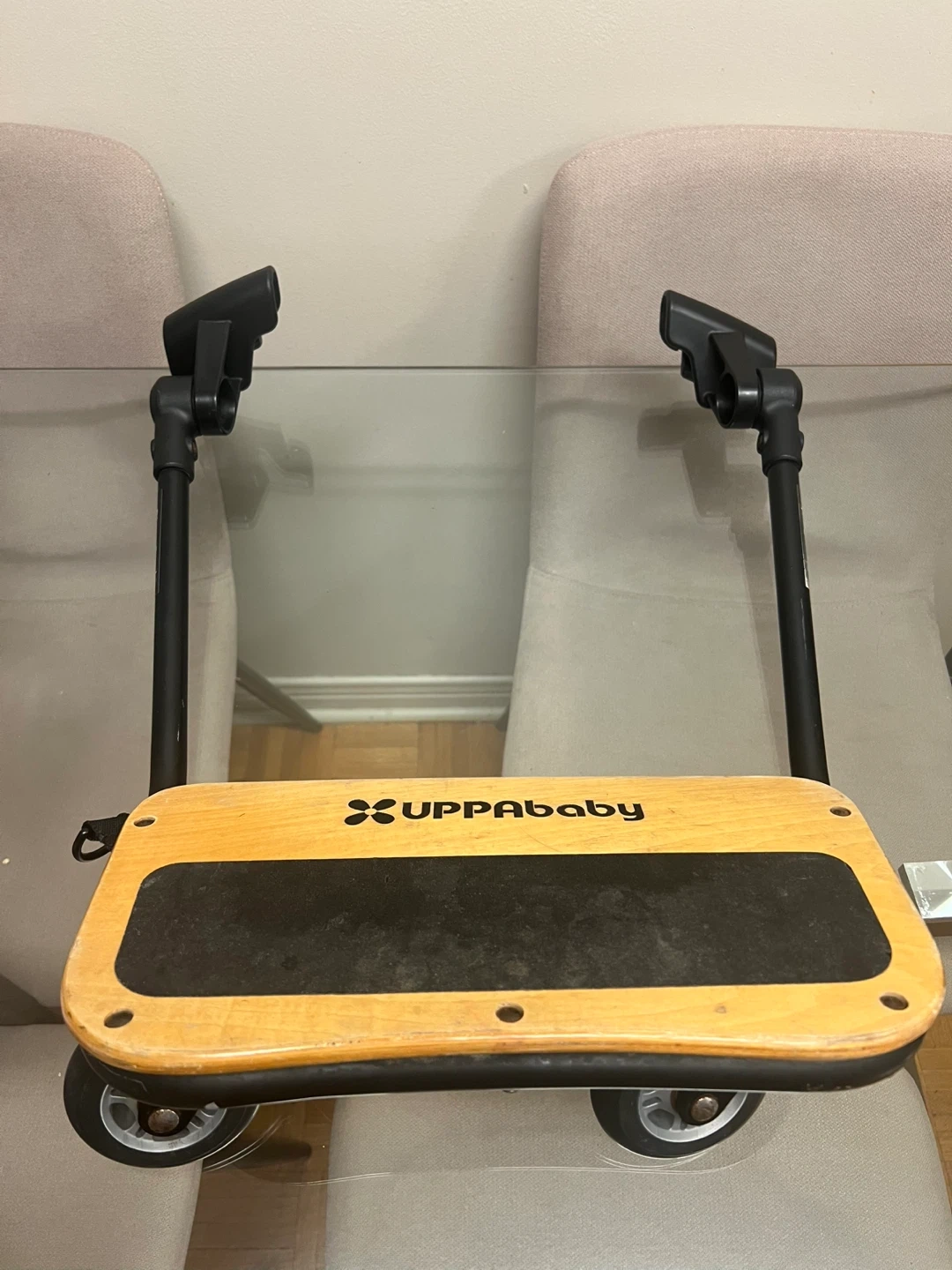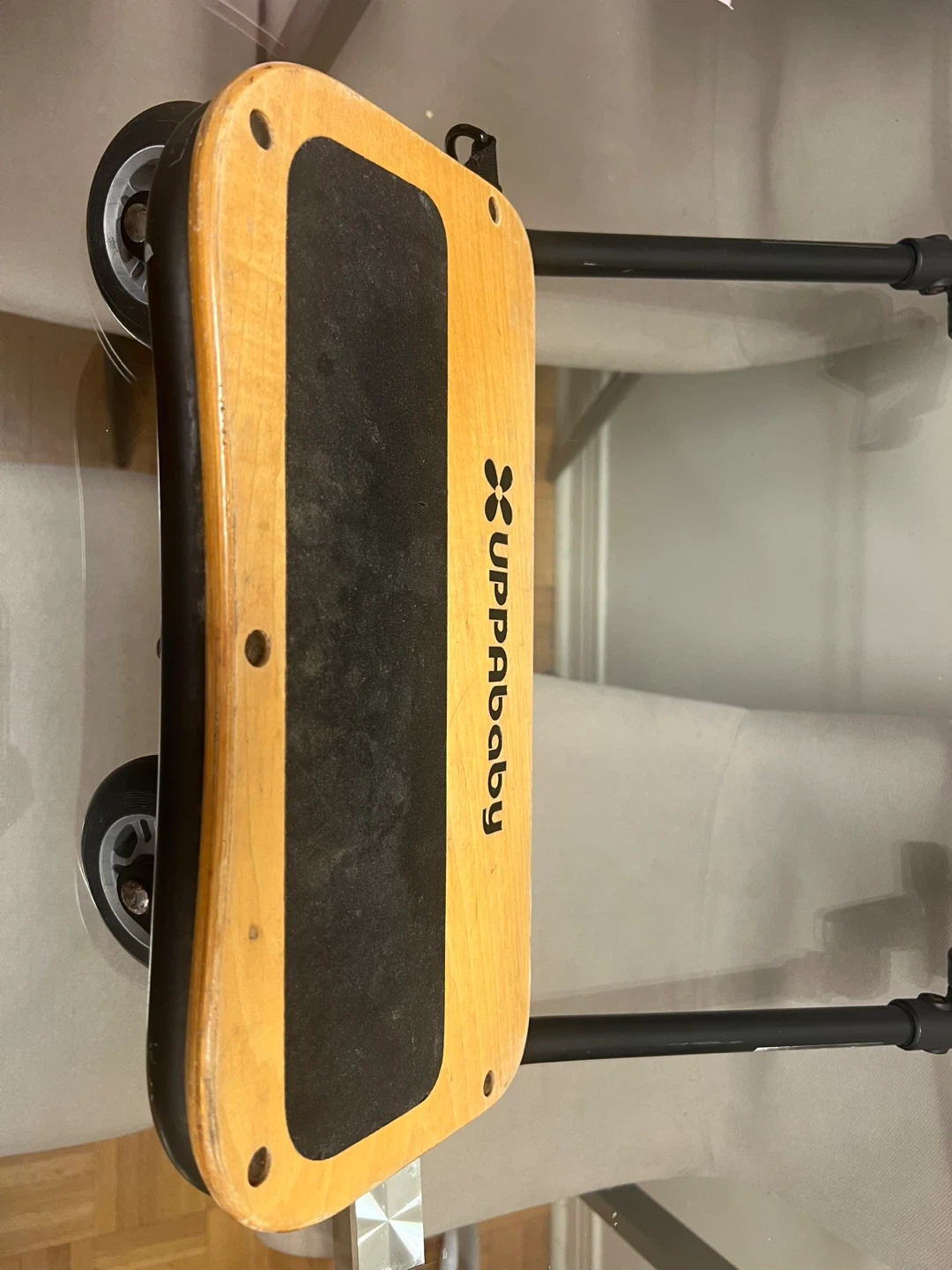 Selling a used UPPAbaby PiggyBack ride-along board. It's designed to attach to your UPPAbaby stroller, letting an older child ride along when they're tired of walking. Suitable for children aged 2-6 years, or up to 55 lbs. It shows some signs of wear, but is still fully functional and ready for use!