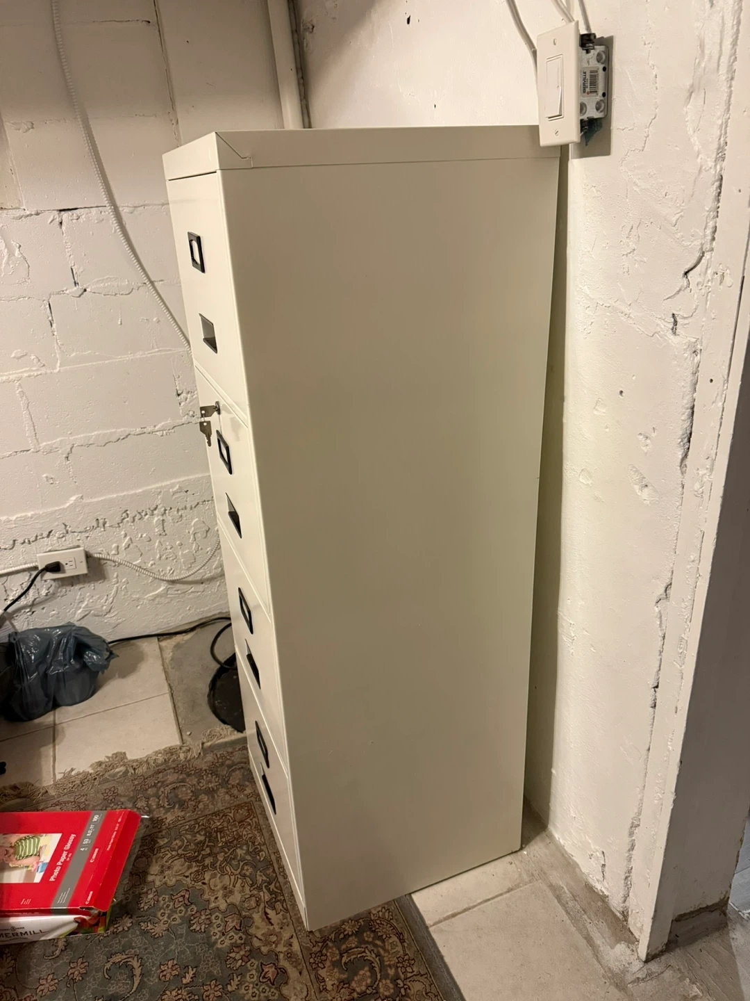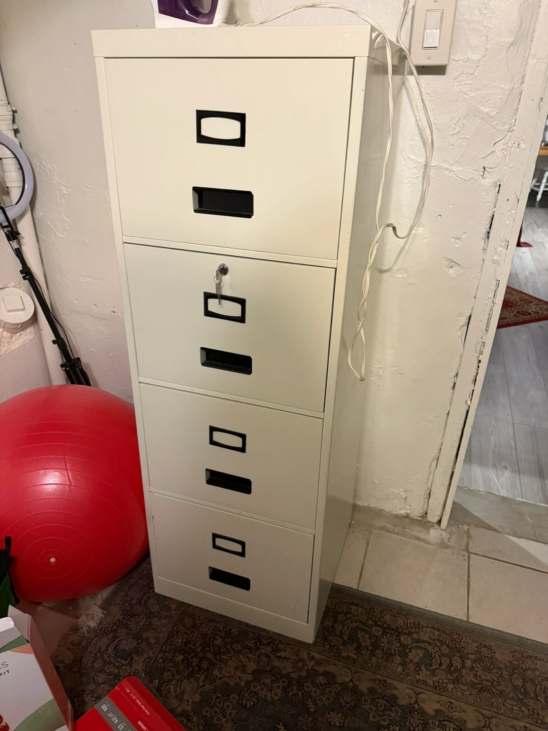 Metal file cabinet, working fine. Minor scratches but overall very good shape. I transported it in a sedan when I got it, so it’s possible to put it in a regular car, in case you were wondering.
