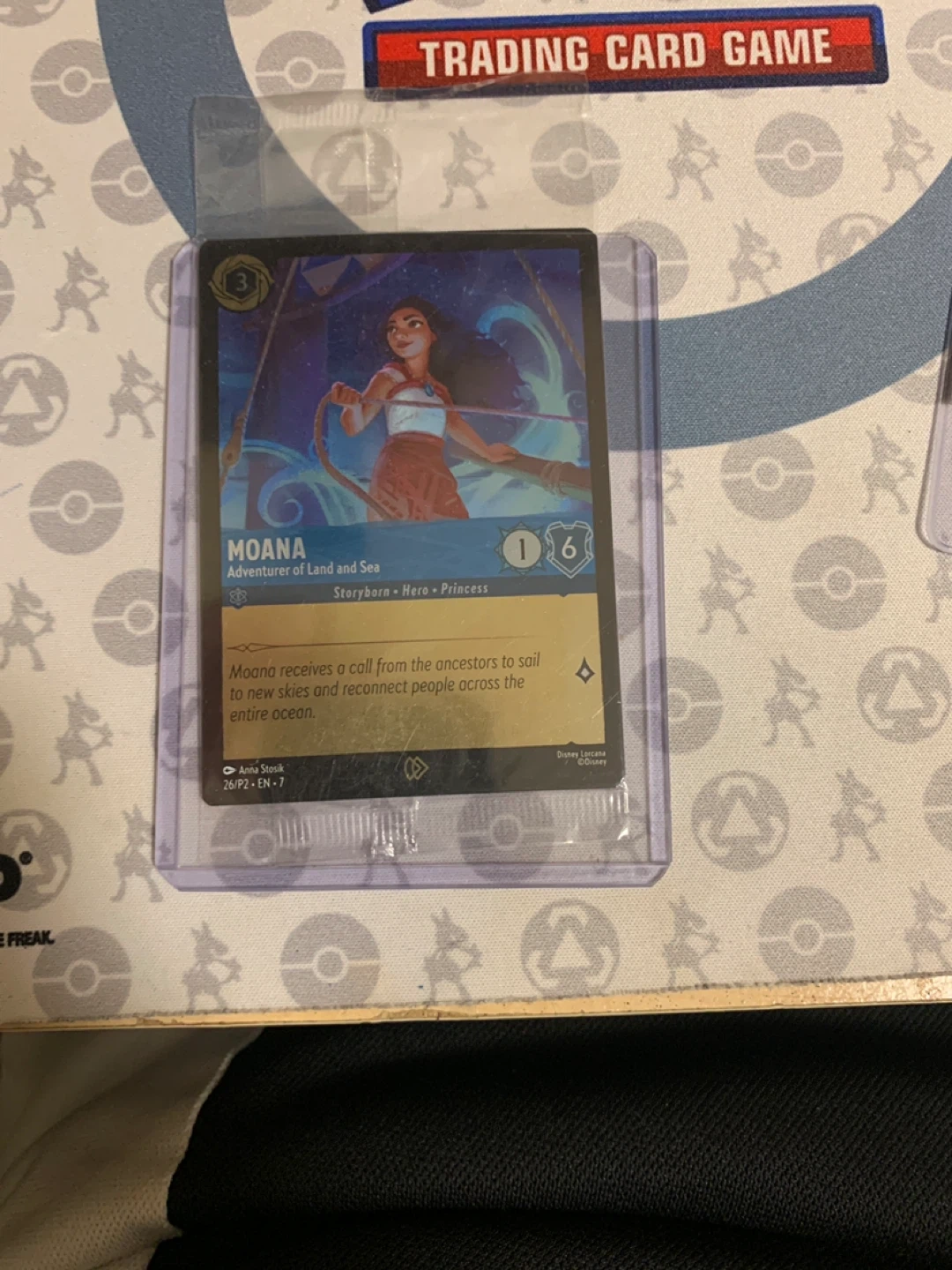 Selling a Moana 'Adventurer of Land and Sea' trading card from the Disney Lorcana series! This card features the Storyborn Hero Princess Moana. A great addition to any collection