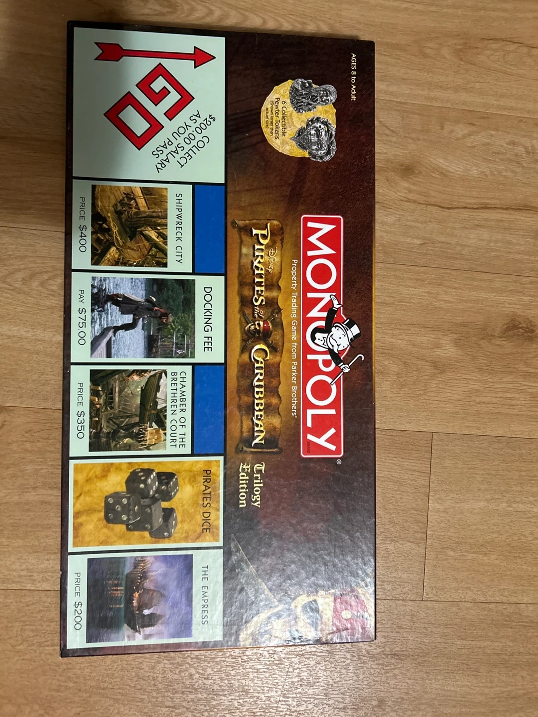 Selling a Monopoly Disney Pirates of the Caribbean Trilogy Edition board game! It's in great shape and ready for a new home. Ages 8 to Adult