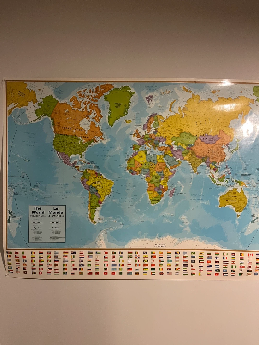 This large (38”x50”) poster of the world is both decorative and educational. Along the bottom are the flags of all the countries. It’s made of plastic, so easy to put up on the wall or roll up for storage.