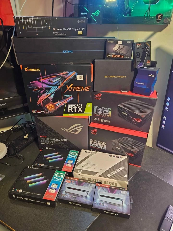249Custom-built, open-loop water-cooled gaming PC, meticulously designed for extreme performance and style. This setup is ideal for gamers, streamers, or content creators who want maximum power and cooling efficiency with a unique, display-ready look. Key Features: Dual-Sided Water Block for GPU VRAM Cooling: The Gigabyte Aorus Xtreme RTX 3090 comes equipped with a dual-sided water block, ensuring both the GPU core and VRAM stay cool under heavy loads. This setup allows for maximum overclocking stability and performance gains. This also has its own separate Power Supply with Wattage output visible to manage overclocking easier. Premium Components: Built with high-end parts, including an Intel i9-11900K CPU, ASUS ROG Maximus XIII Hero motherboard, and Team Group 40 GB 4000 MHz RAM. Custom Water Loop with RGB Accents: The custom loop includes a top-tier XSPC EX480 Quad Radiator, Lowara D5 PWM pump, and Pacific Thermaltake RGB fittings, adding both cooling performance and RGB style. Thermaltake Core P5 Open-Air Case: Wall-mounted and open-air design showcases every component, perfect for enthusiasts who want their rig on display. Complete Water Management Accessories: I’m including all my water management accessories—funnel, drain tube, extra PETG tubing from XSPC, and spare fittings—making it easy for you to maintain or customize the loop. Original Cost: Over $5,600 CAD. Your Price: Asking $3,500 CAD – an incredible value for a build of this caliber! Why Buy This PC? Save Over $2,000: Get a premium custom-built rig without the premium price tag. Optimized for Overclocking: The unique water block on the GPU allows you to push performance limits, making this perfect for competitive gaming or rendering. Ready for Display: This build isn’t just high-performance—it’s a visual masterpiece that will turn heads. Message me if you're interested or have any questions. Serious inquiries only, please!