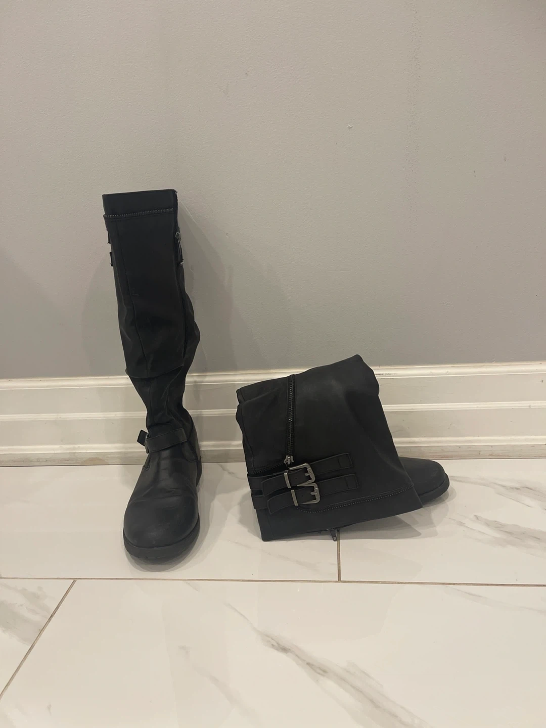 10knee-high boots with zipper detail and buckle accents - Great for adding a bit of edge to your outfit! Size 8 Set price cash payment only.