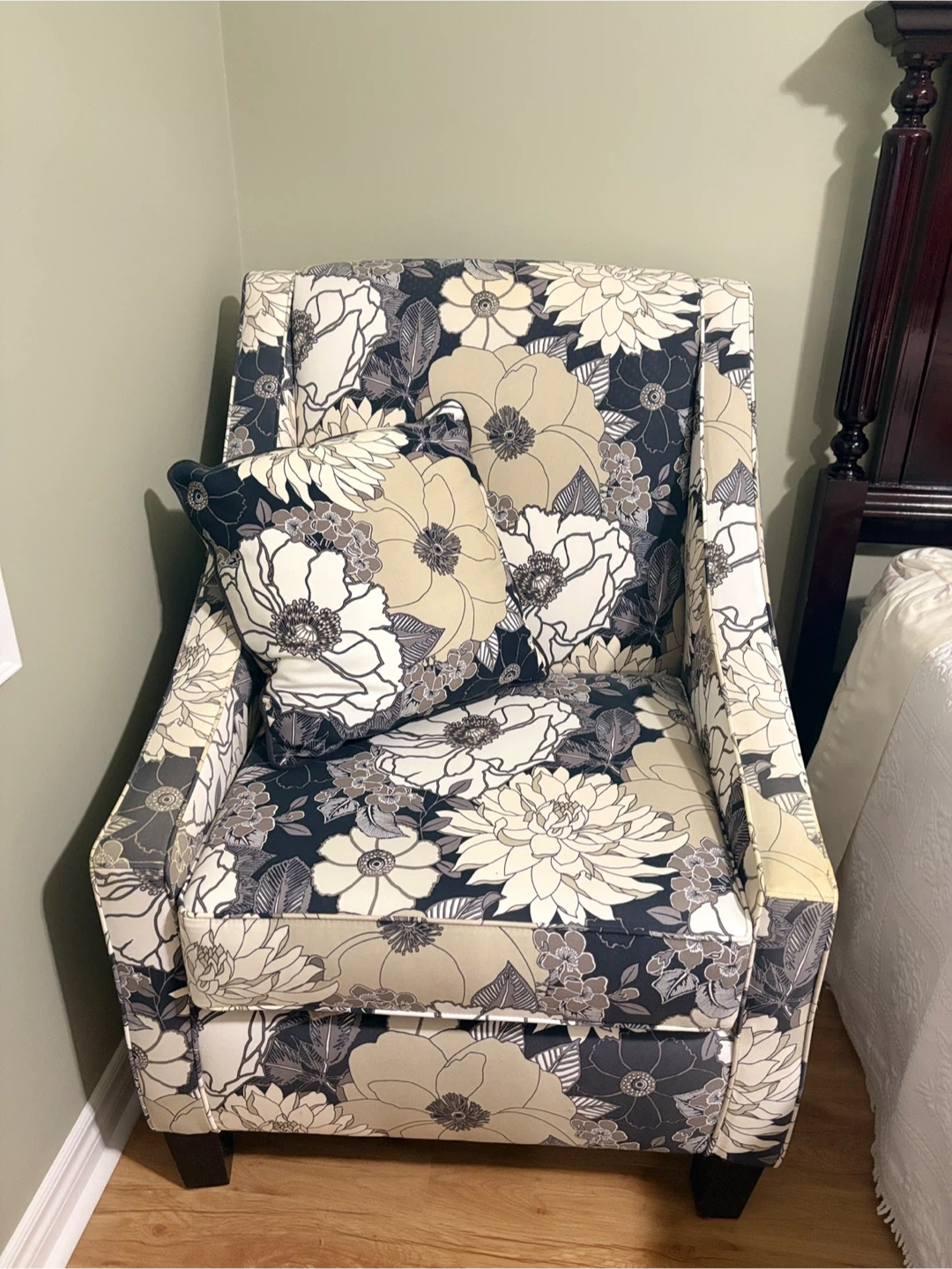 Selling a lovely accent chair featuring a floral pattern. It comes with a matching pillow for extra comfort. The chair is in great condition and would be a stylish addition to any room!