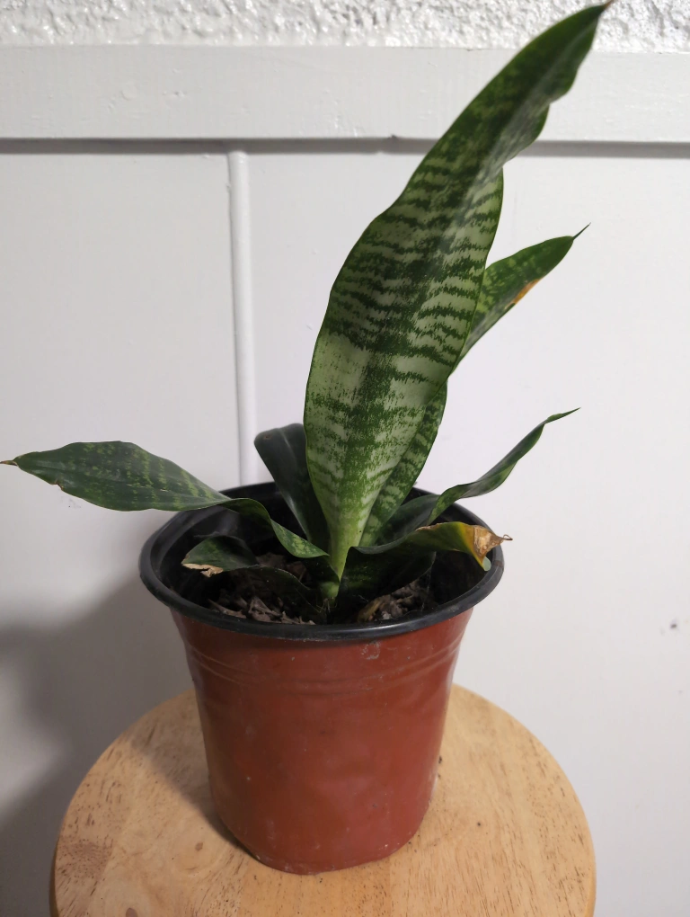 76Selling a snake plant in a brown plastic pot. It's a great indoor plant that's easy to care for. I could also trade for a good plant. 🪴