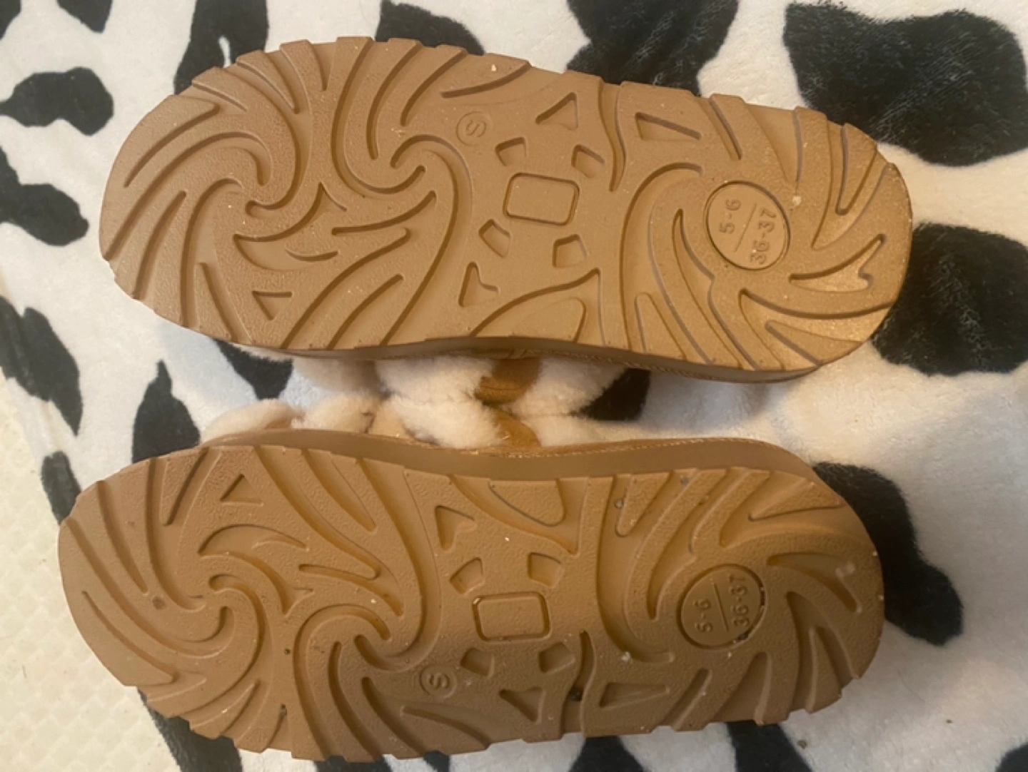 Cozy platform slippers Features a criss-cross strap design. Tan and cream colour scheme. Fluffy, soft material. Size 6 worn 3 times got new slippers asking $12 pick up near capilano thank you