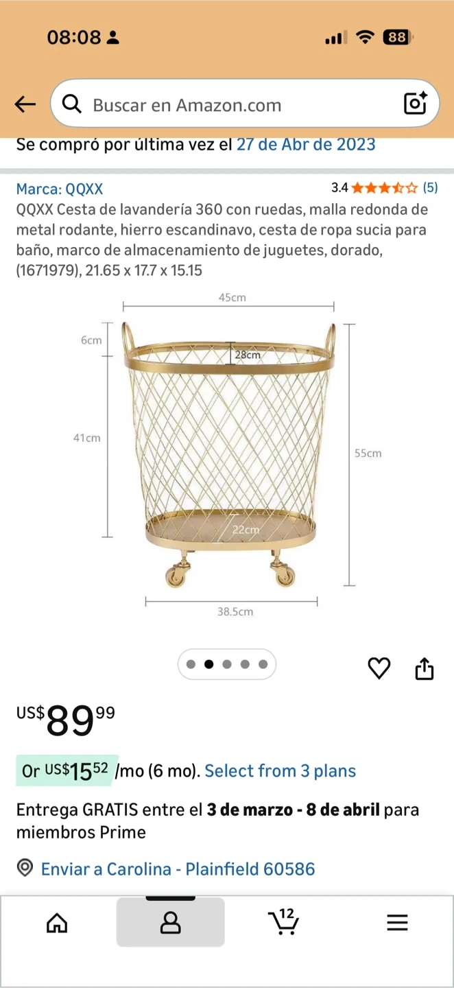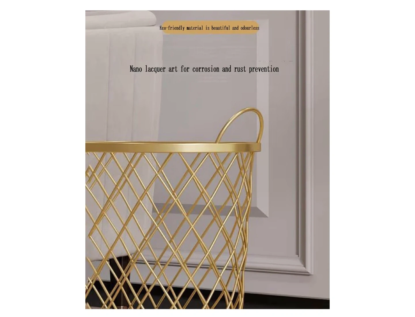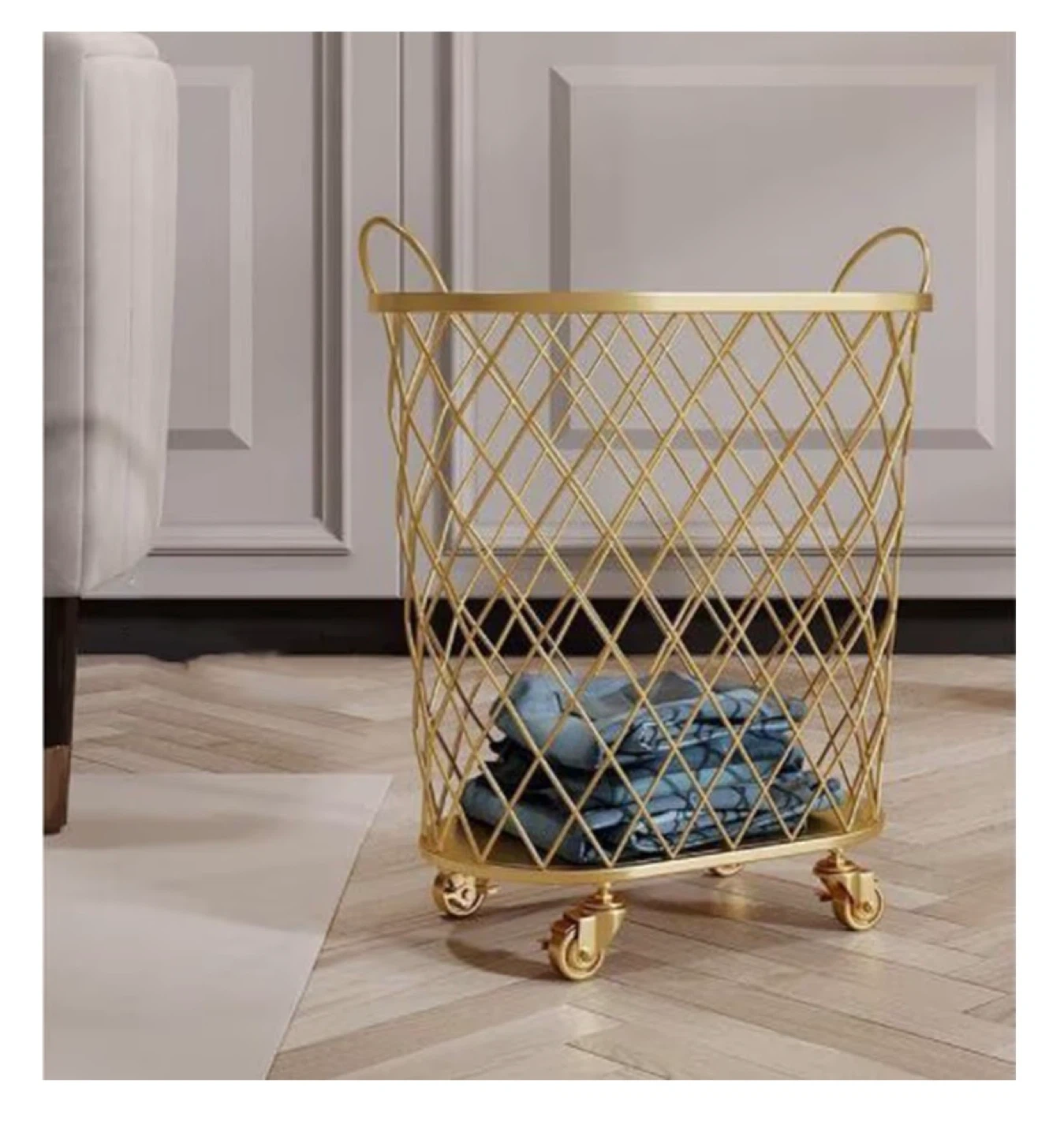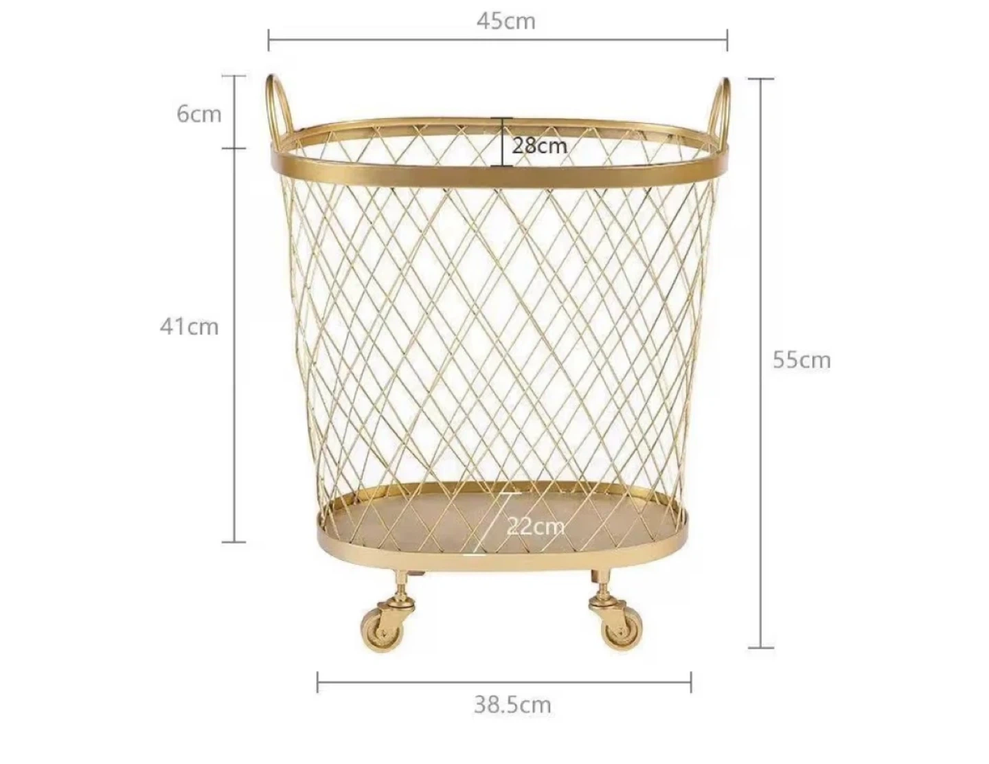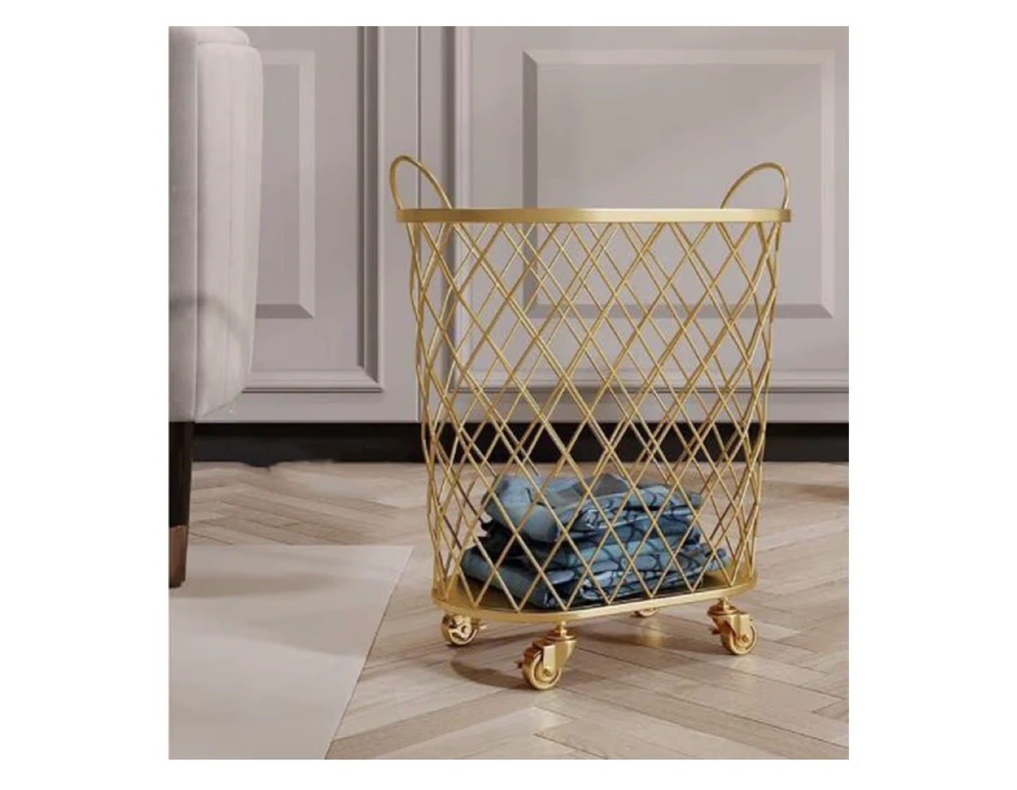 This gold metal basket features a diamond-shaped wire design and comes with universal wheels for easy movement. It has handles on top and a base tray. Dimensions: 45cm x 38.5cm, Height 55cm. The nano lacquer art helps prevent corrosion and rust. It's a stylish solution for storing clothes.