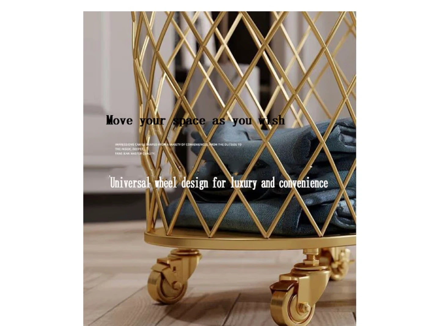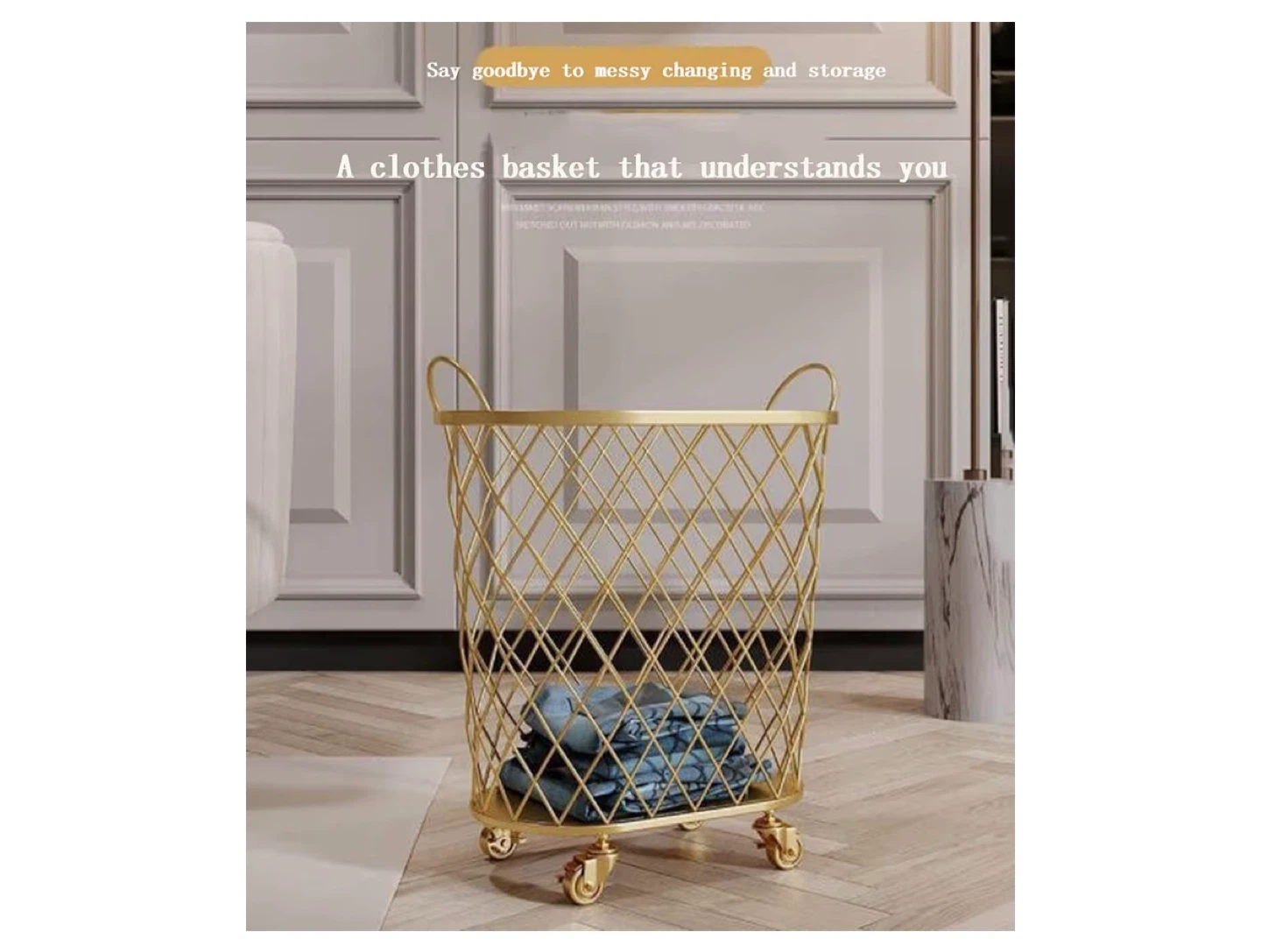This gold metal basket features a diamond-shaped wire design and comes with universal wheels for easy movement. It has handles on top and a base tray. Dimensions: 45cm x 38.5cm, Height 55cm. The nano lacquer art helps prevent corrosion and rust. It's a stylish solution for storing clothes.