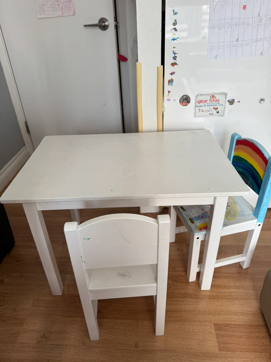 Ikea kids Table and a chair set. If you don’t mind my kids’ drawing on the another chair, it’s all yours. First comes first serve.