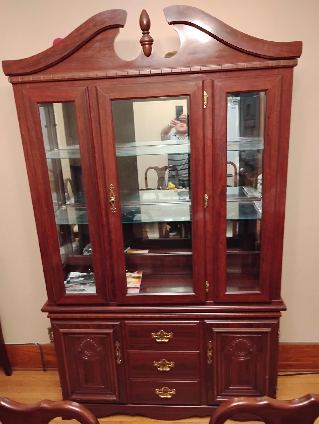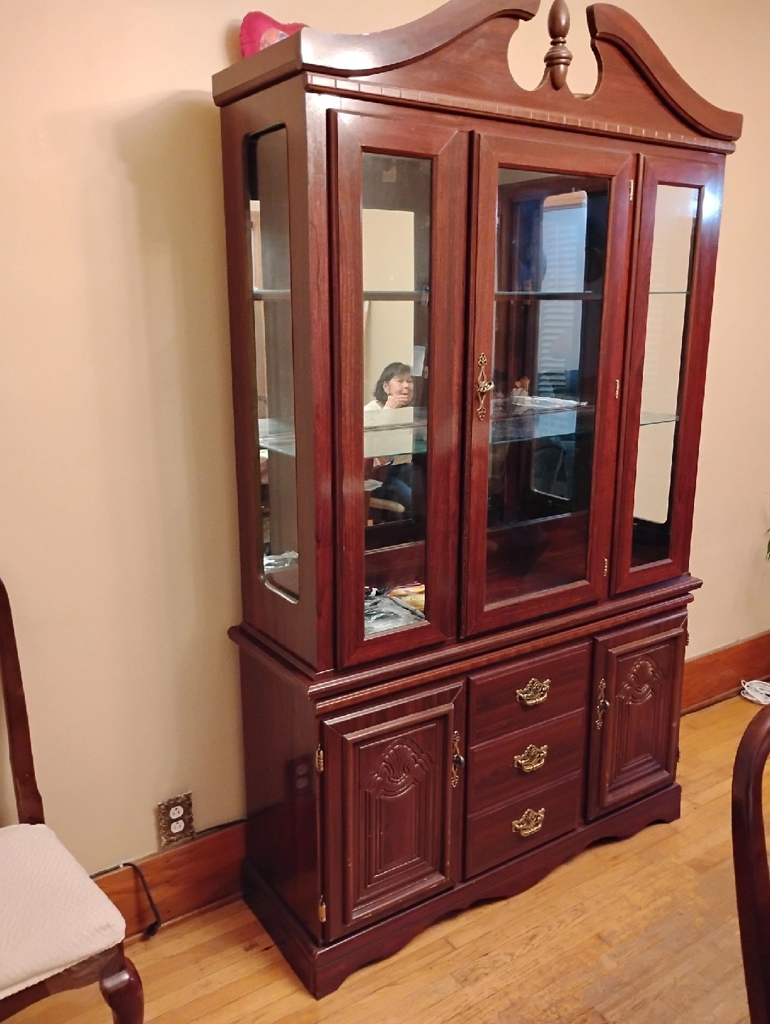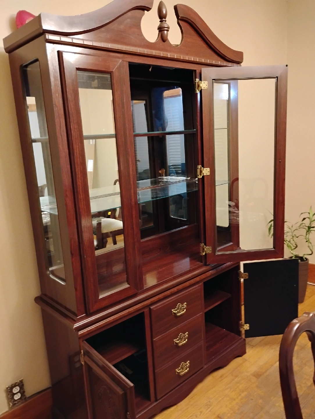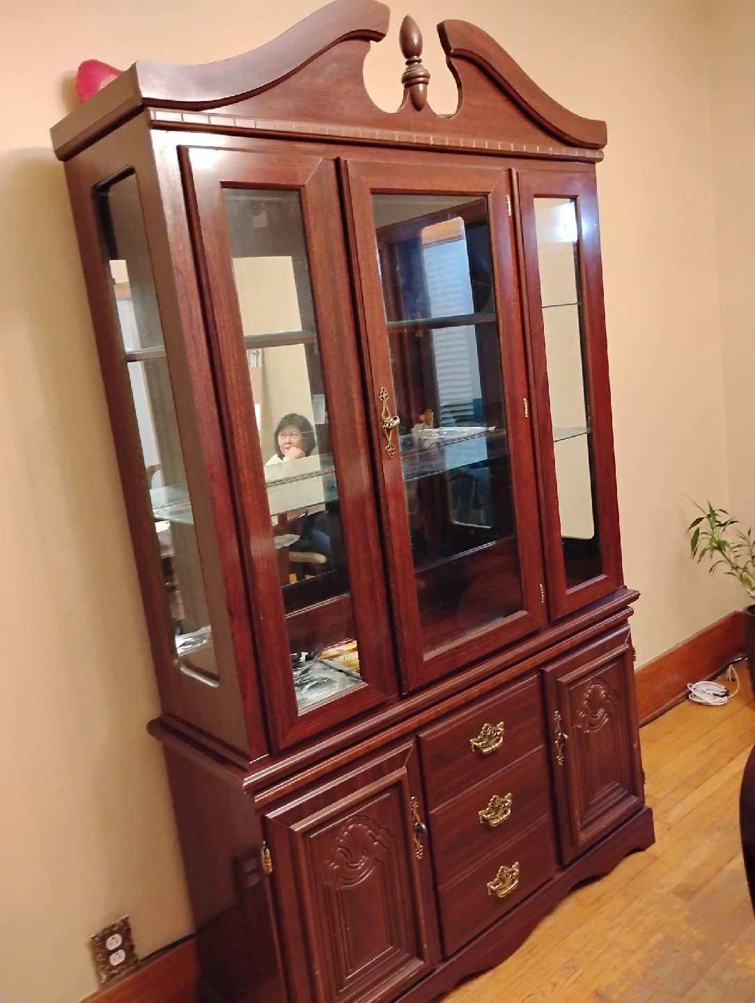 Selling a wooden china cabinet. It has glass doors on the upper half and wooden doors and drawers on the lower half. It has a dark brown finish and gold-coloured hardware. Perfect for displaying your fine china or other collectibles!