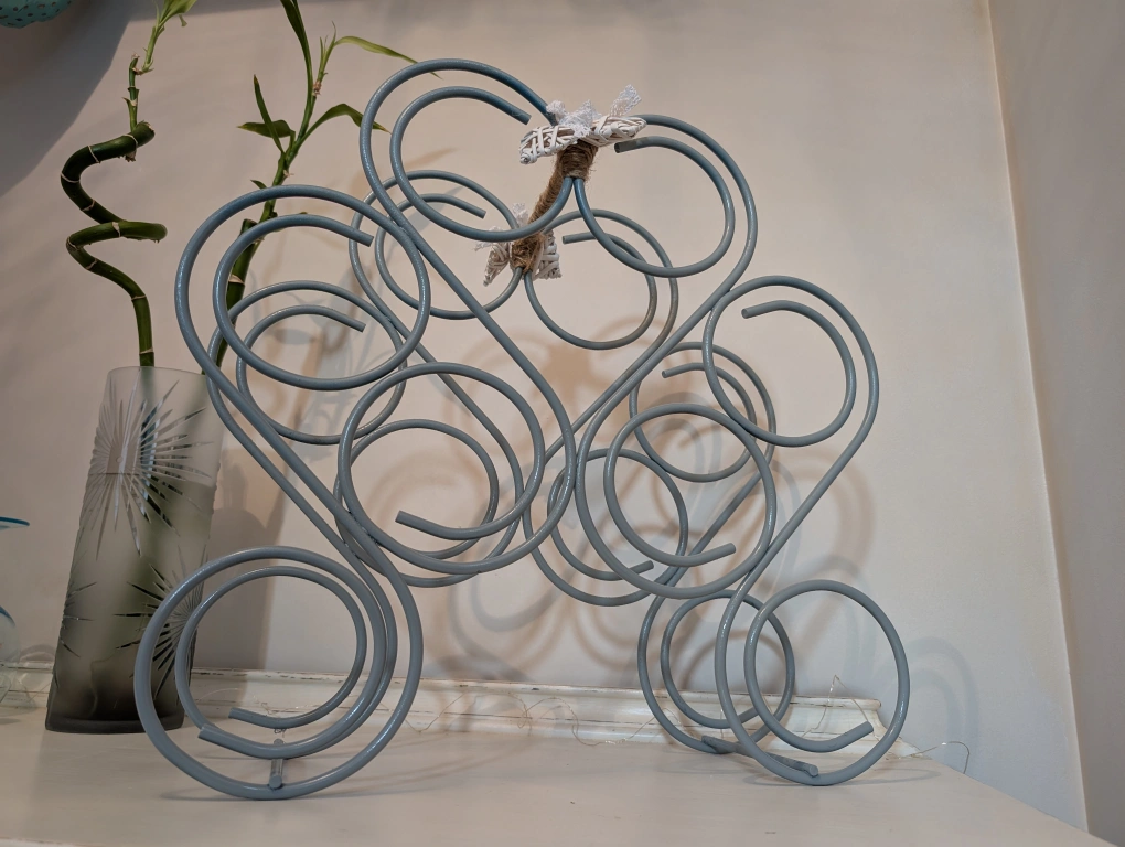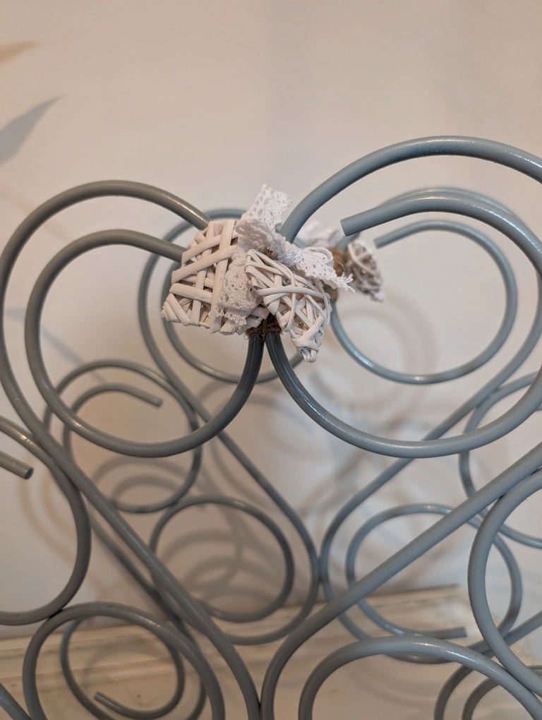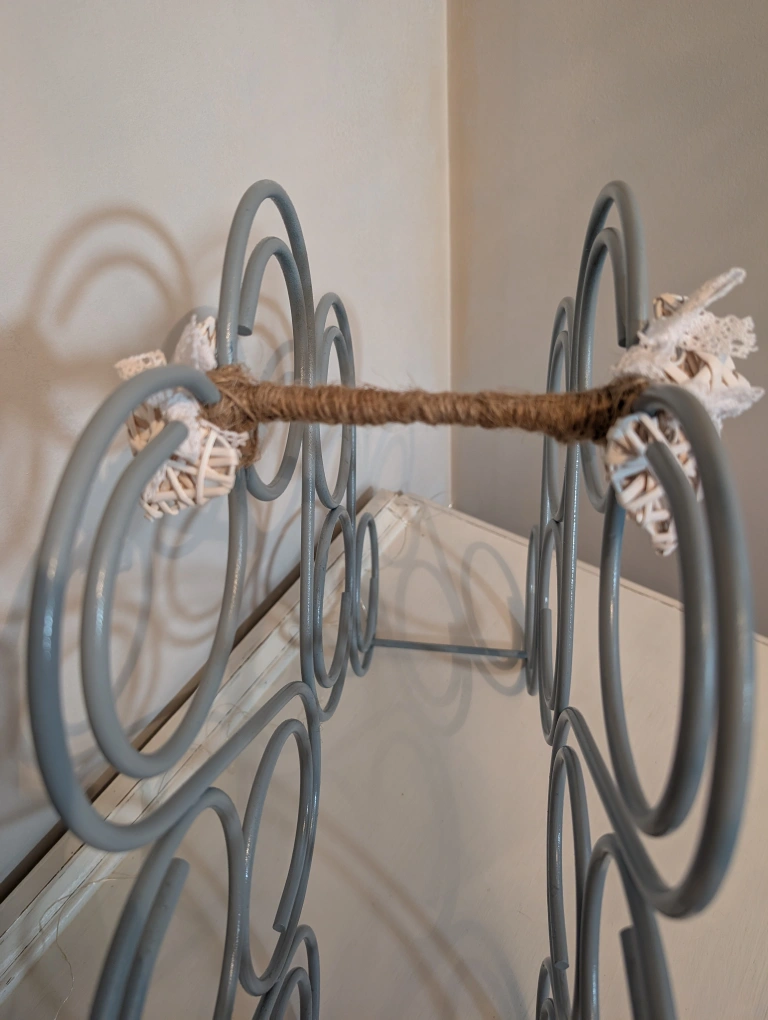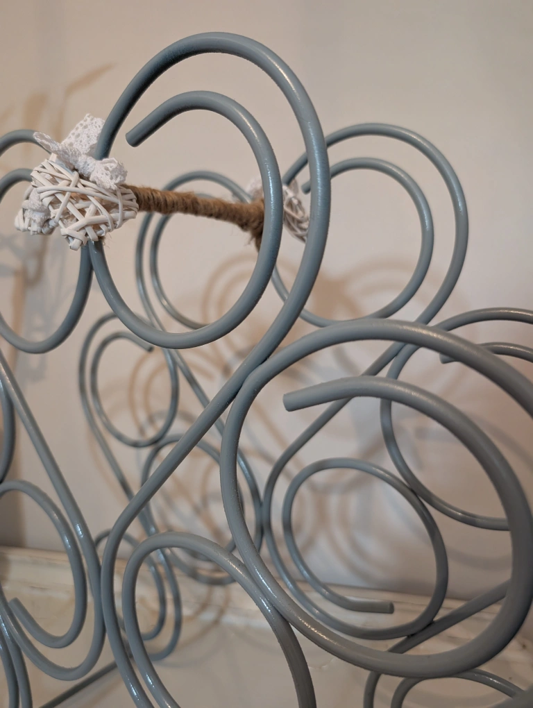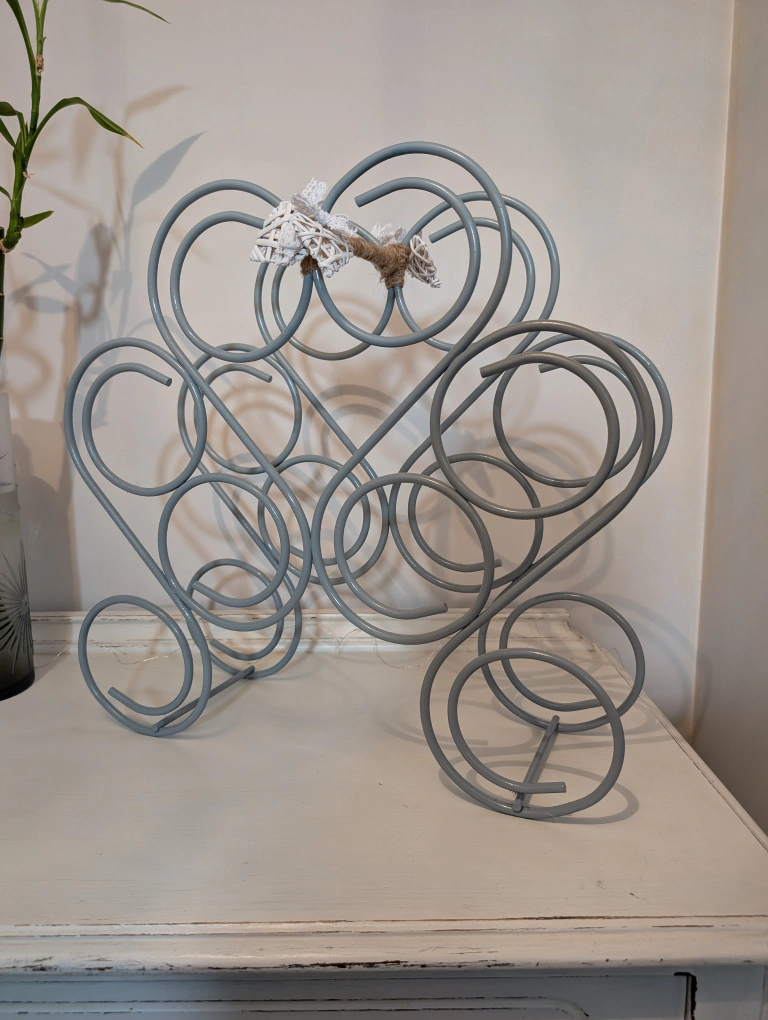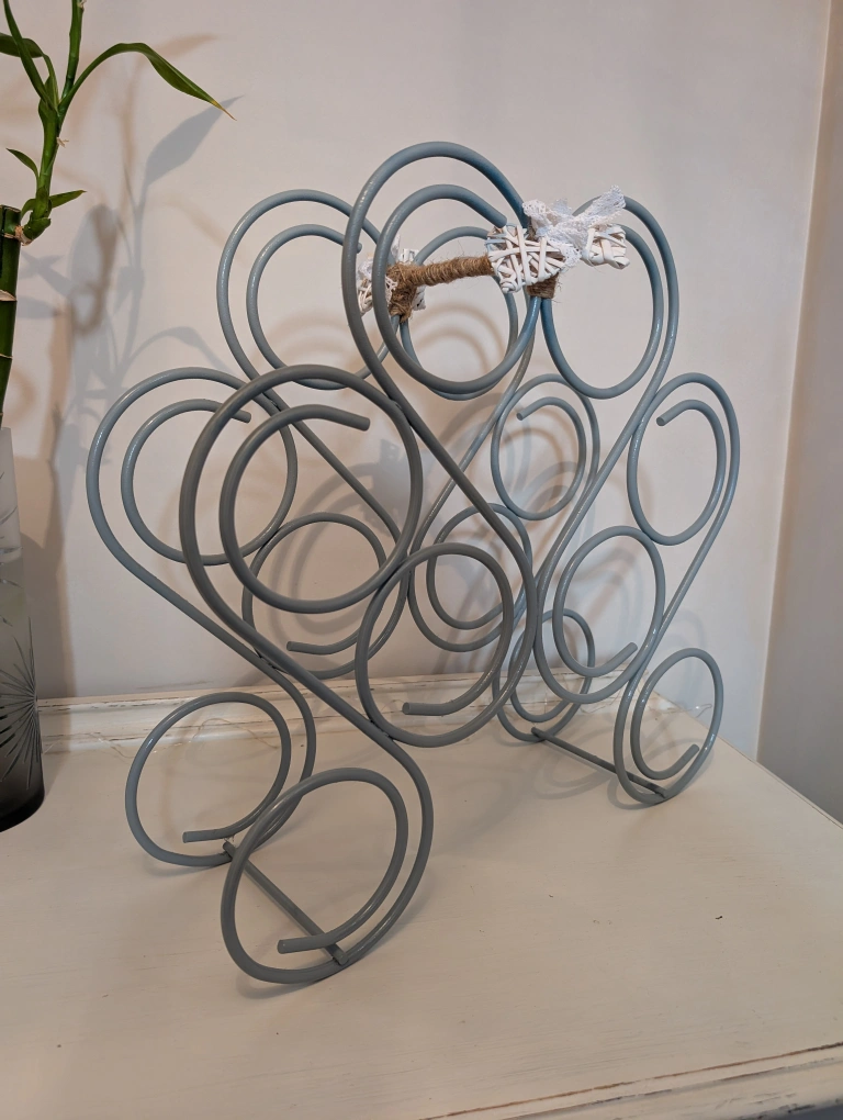 Selling a redesigned grey metal wine rack. It's in excellent condition and can hold multiple bottles. Perfect for adding a touch of elegance to your dining area or kitchen. Country vintage/ shabby chic decor. Dimensions: 18 3/4" W x 18 1/8" H ➡️ Door pick up ➡️ Cash or e-transfer