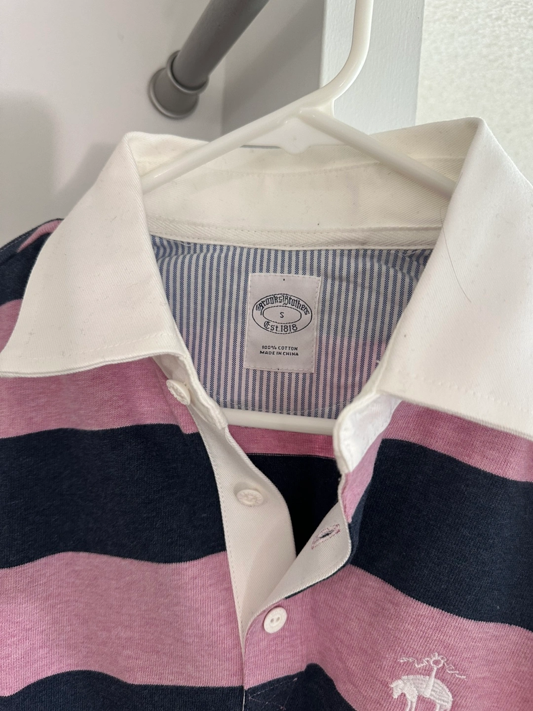 Here's a Brooks Brothers rugby shirt in size small! It features a pink and navy striped pattern with a white collar. Original price 170$. The shirt is made of 100% cotton and is in great condition. Perfect for a casual, preppy look