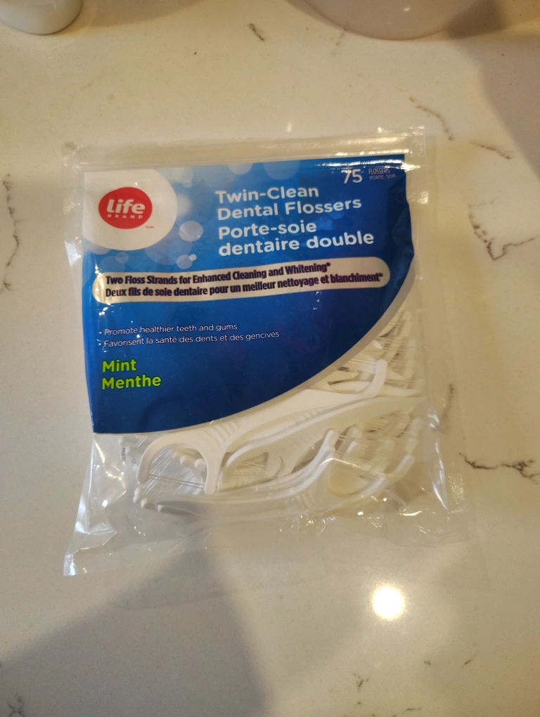 Selling a pack of Life Brand Twin-Clean Dental Flossers! It contains less than 75 flossers. They're mint flavoured to promote healthier teeth and gums and enhance cleaning and whitening.