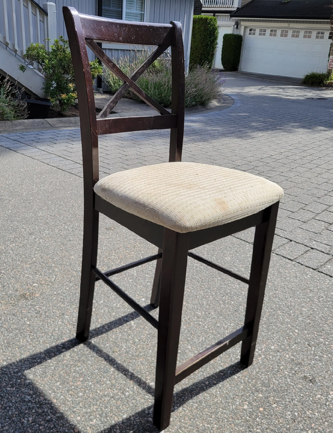 Here's a dark brown counter height stool / chair with a beige fabric seat. It has a cross-back design and is perfect for a kitchen island. There are some signs of use on the seat, but overall it's still in good condition. Seat height is 25". Let me know if you are interested.