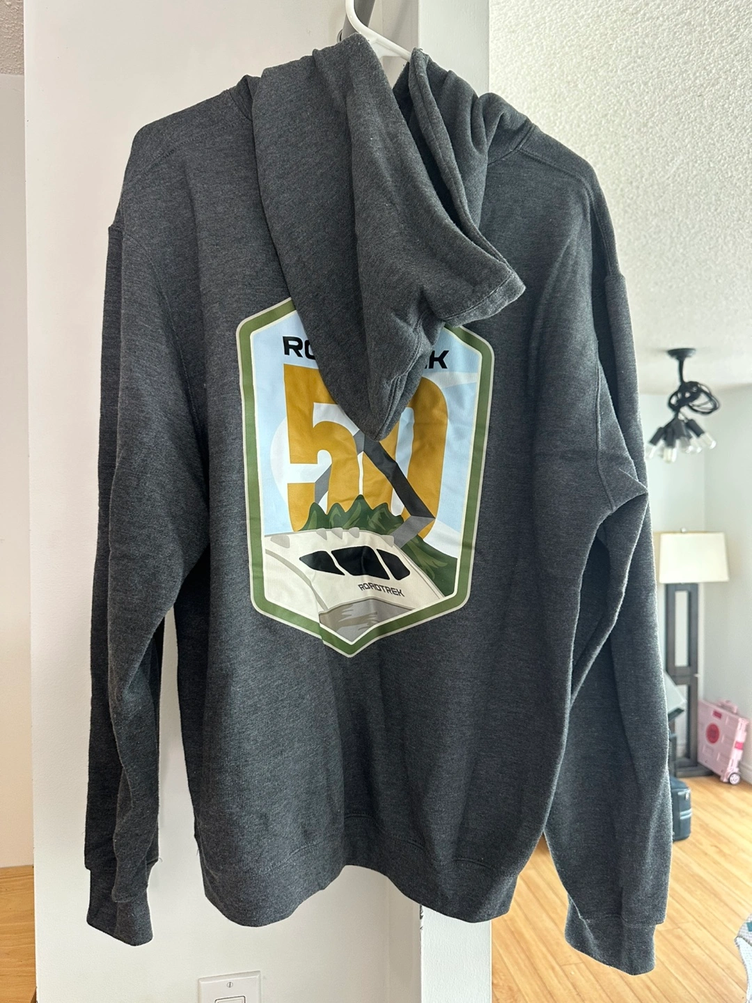 Selling a Roadtrek 50th anniversary hoodie in grey! It's in great condition and features the Roadtrek logo on the front and a special 50th anniversary design on the back. Perfect for any Roadtrek enthusiast!