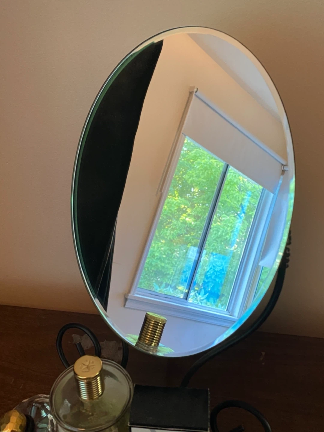 Here's a lovely oval vanity mirror with a decorative black metal stand. It would look great on a dresser or vanity table. The mirror is in good condition and ready for a new home!