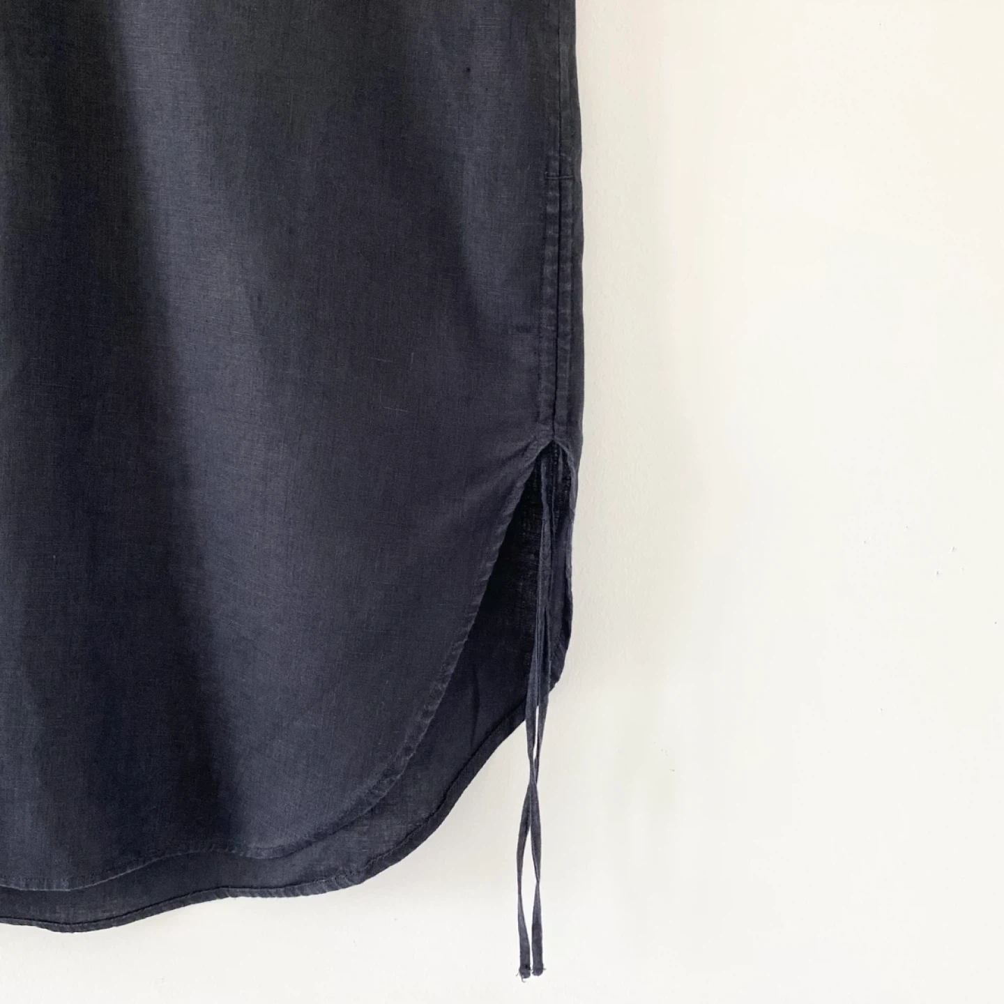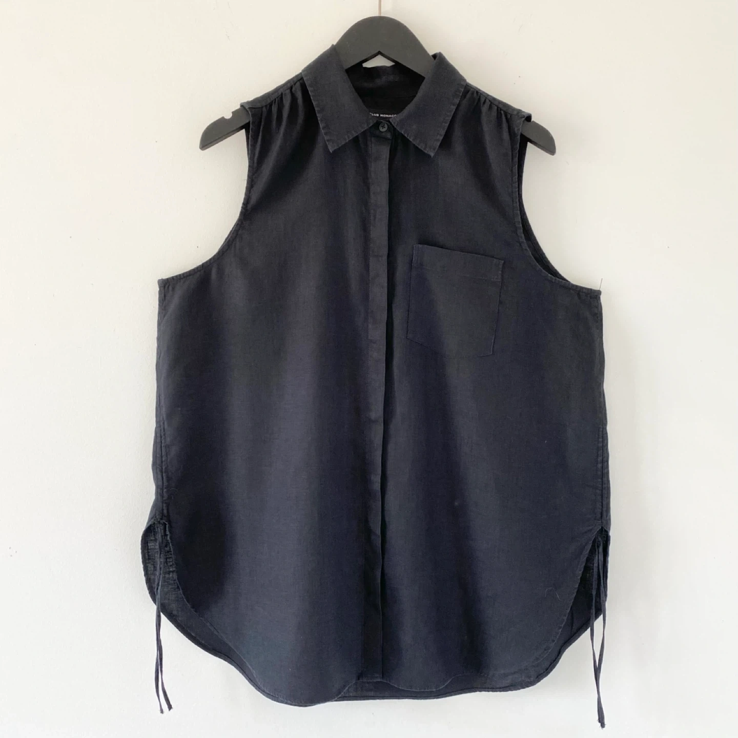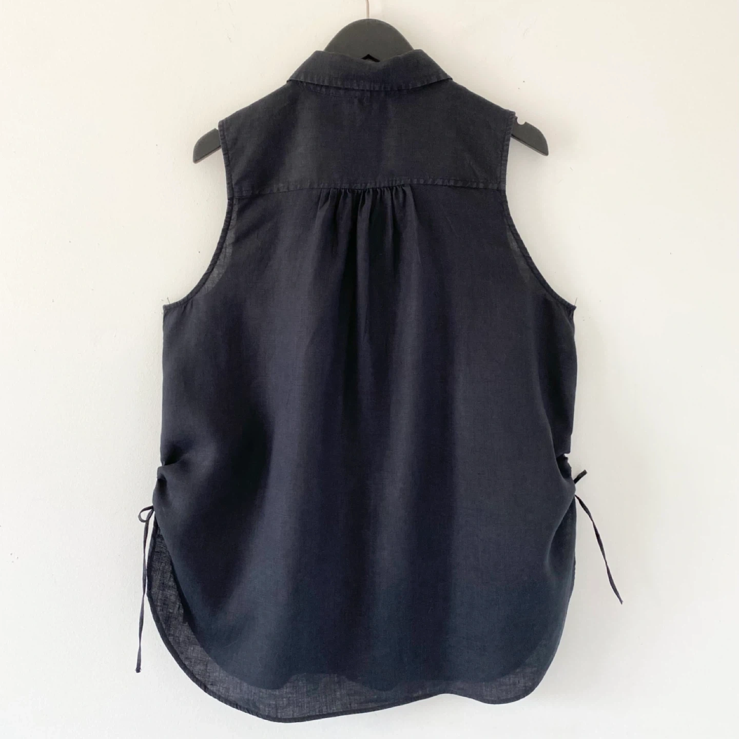 Club Monaco sleeveless blouse with curved hem and side seam adjustable string to create rushing. Made of lightweight 100% linen in black. It's breezy, crisp and drapes beautifully. There's no staining or damage. It's clean and in excellent condition.