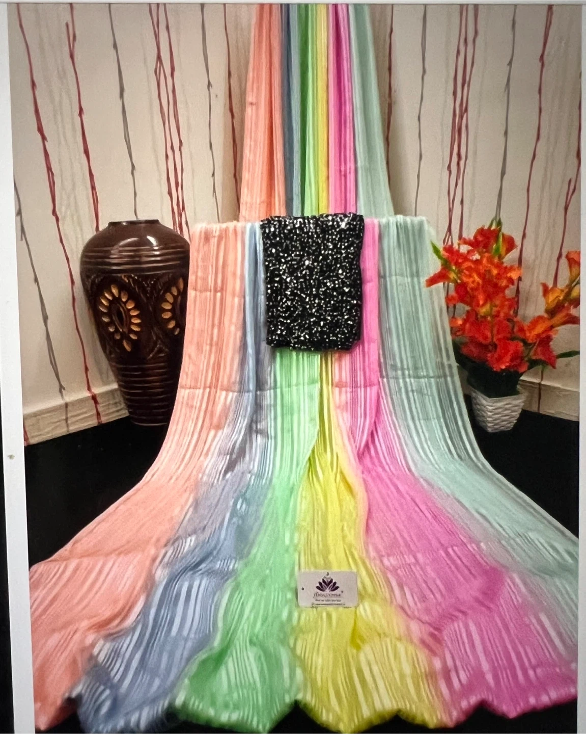 Selling a beautiful rainbow coloured saree .The saree has a lovely pleated texture and a vibrant colour palette, perfect for a special occasion or adding some fun to your wardrobe.