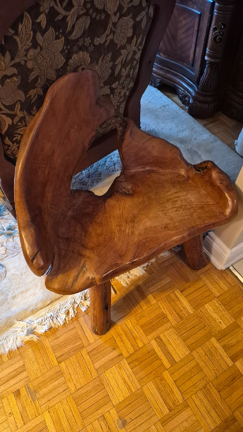 Unique live edge wood accent seat. This piece adds a natural, rustic touch to any room. It's sturdy and has a beautiful wood grain pattern. Perfect for a small space or as a statement piece!
