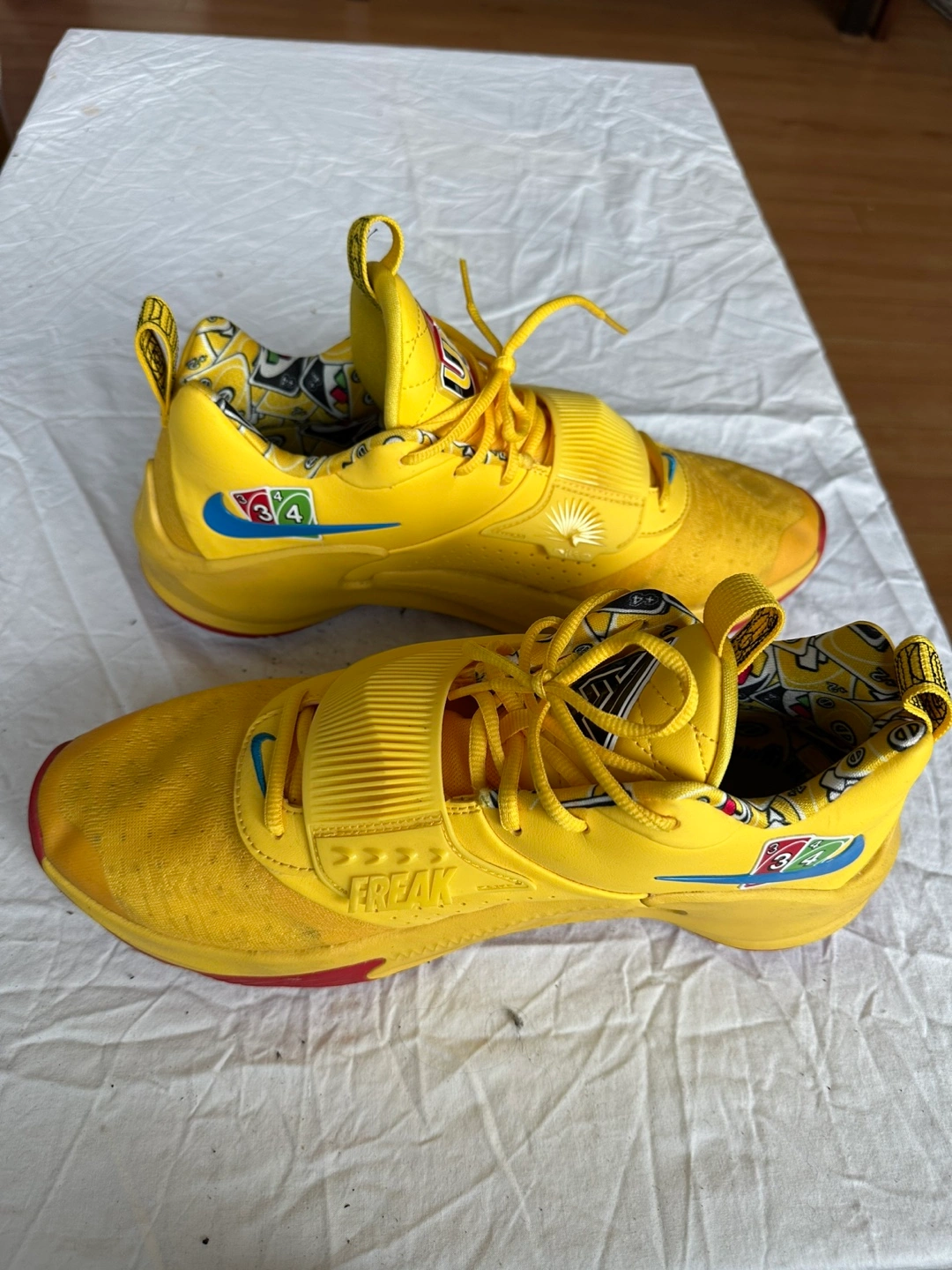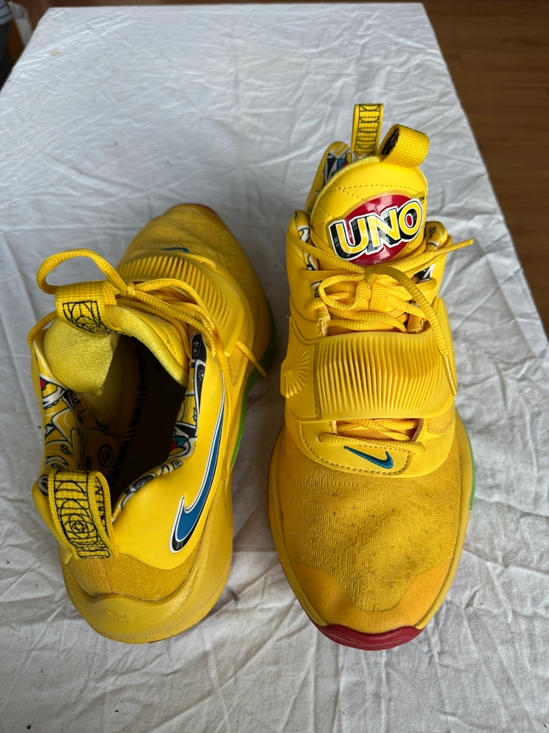 Selling a pair of Nike Freak shoes in yellow, inspired by the card game UNO! These shoes feature the UNO logo and colours. They have a unique design and are sure to turn heads!