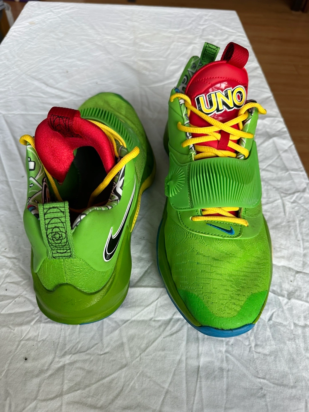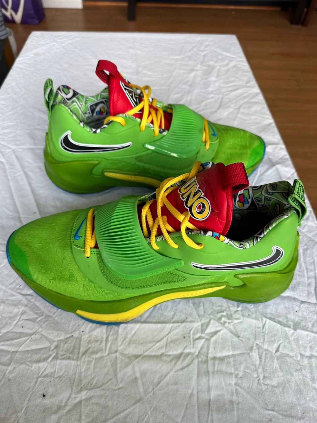 Selling a pair of Nike Zoom Freak 4 UNO sneakers in a vibrant green colour! These are in great condition and ready for a new home. Features include a unique design inspired by the classic card game UNO. Perfect for basketball or casual wear!