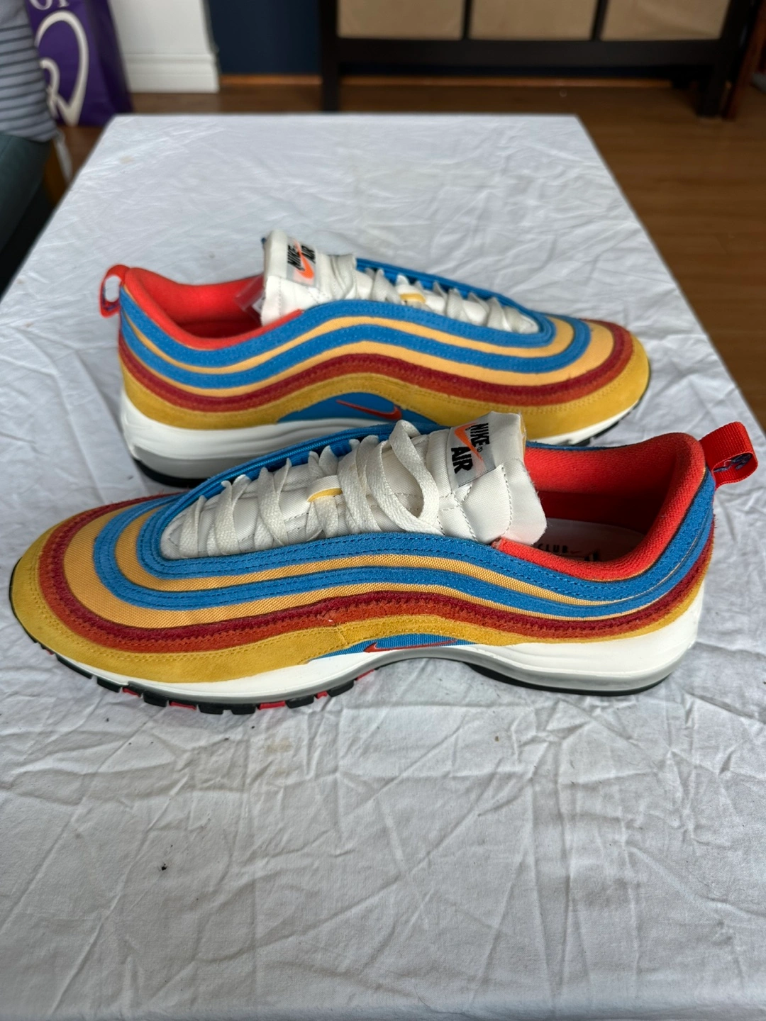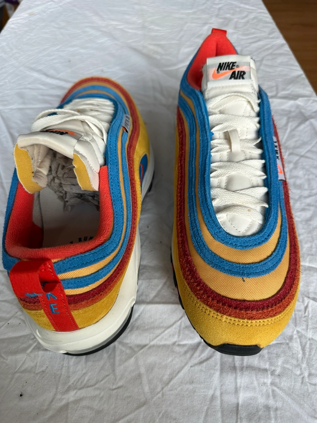Selling a pair of Nike Air Max 97 sneakers. They feature a unique colourway with yellow, blue, and red stripes. Size 12 . Great for adding a pop of colour to your outfit!