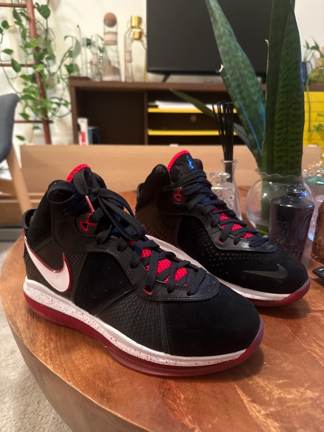 Selling a pair of Nike LeBron 8 V2 Low sneakers in black and red. These shoes are in good condition and ready for a new home! They feature a white Nike swoosh on the side and red detailing throughout